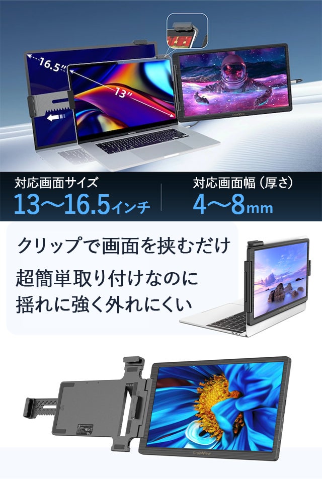 13インチ~16.5インチのモニターにはクリップで浮かせる取り付けも可能で、机のスペースが狭くてもデュアルモニターで作業ができます!