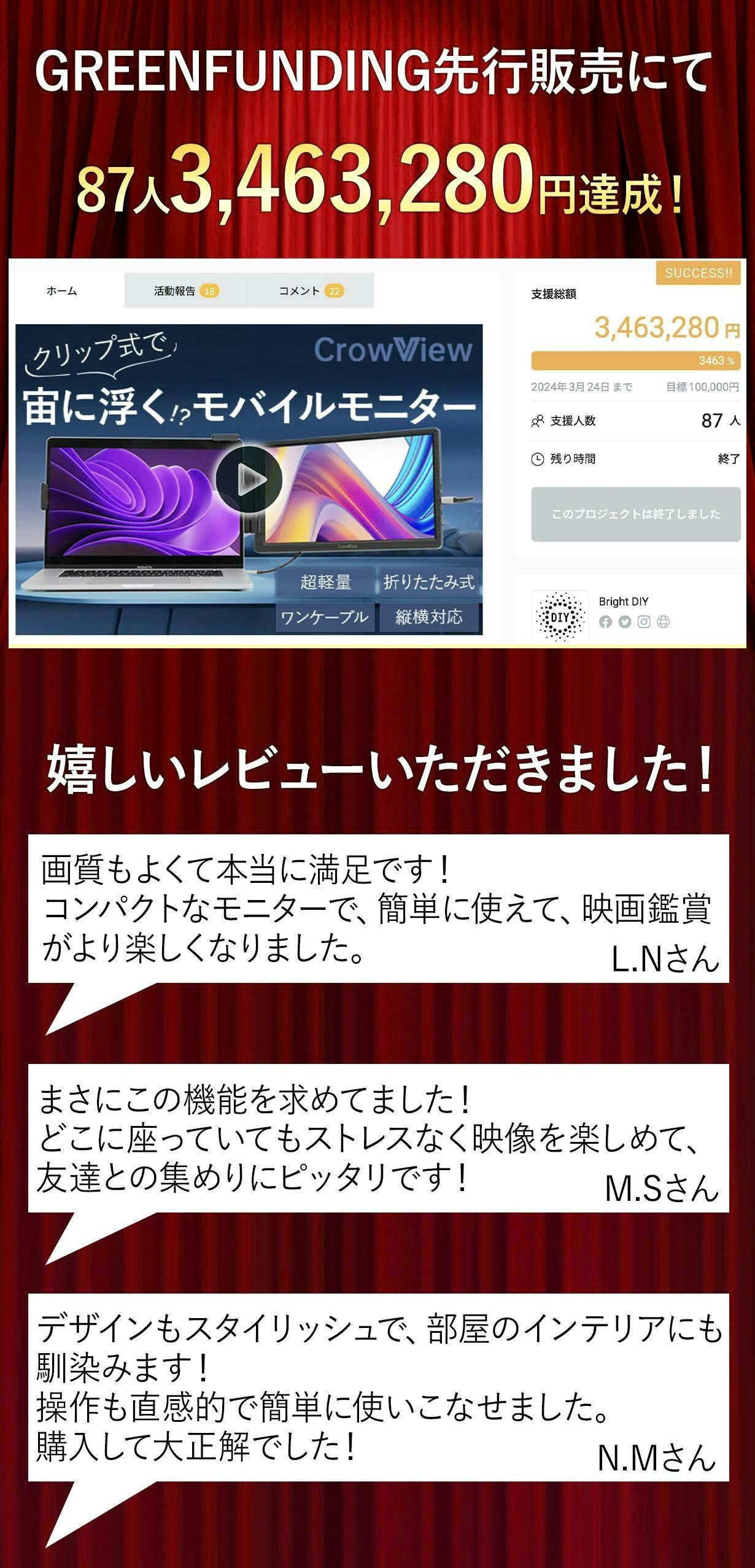2026/01/12 12:00みなさん、こんにちは。BRIGHT DIYです。本日は皆さまに新しいプロジェクトを紹介させていただきます。最大39%OFF!!!さらに、公開日より期間限定で使える5%OFFクーポンを発行させて頂きました。━━━━━━━━━━━━━━━━━━クーポンURLhttps://camp-fire.jp/projects/911119/view?ctoken=LKHzolWfhILfwCEKクーポンは1月12日~1月18日限定でご使用頂けます。━━━━━━━━━━━━━━━━━面倒な初期設定一切不要!挿すだけで簡単に映像が転送できる超コンパクトなミラーリングアダプタープロジェクト概要キャンペーン期間 2026年1月12日~2026年2月28日プラットフォーム machi-yaキャンペーンURL https://camp-fire.jp/projects/911119/view※プロジェクト公開後から閲覧可能になります。2026年1月12日 12時からプロジェクト公開となります。数に限りがございますので、早い者勝ちです!!!1点のリターンの場合、先着25名様のみ36%OFFとなります!※早期リターンは在庫がなくなり次第終了となります。※早期リターンは在庫がなくなり次第終了となります。 もっと見る