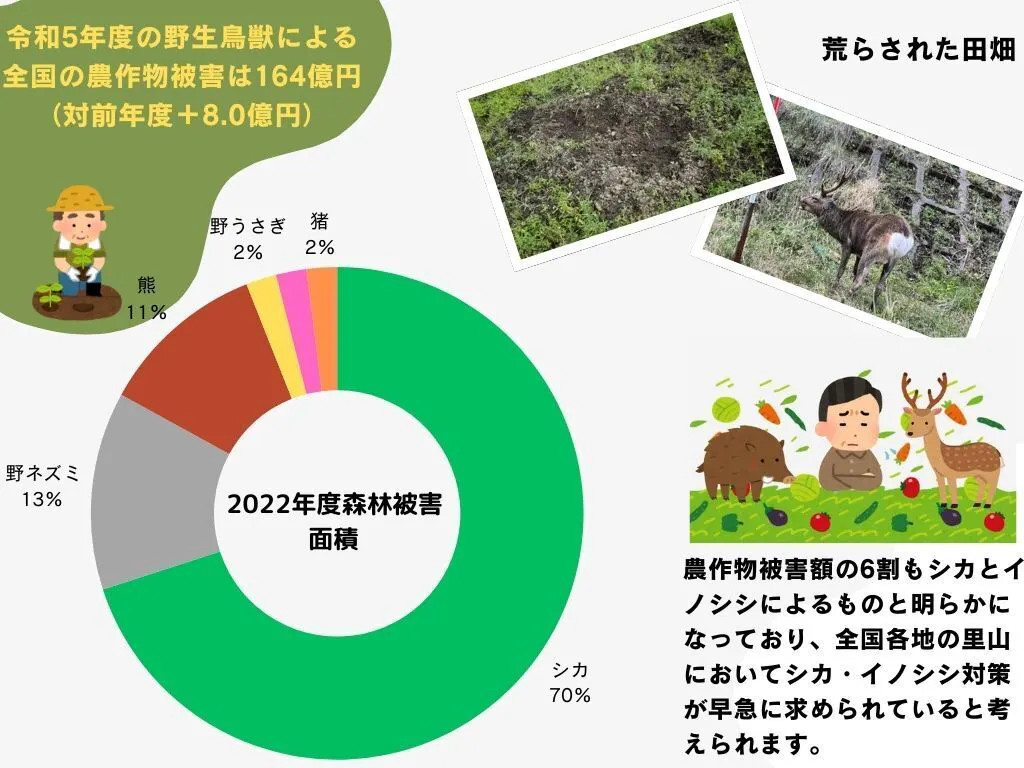 ジビエとは何か、その命は何処からきているのか?環境問題までに発展してい る鳥獣被害についてもっと知っていただき、かけがえのない大切な命を繋ぐ事で循環型の 社会を創造したいと考えています!