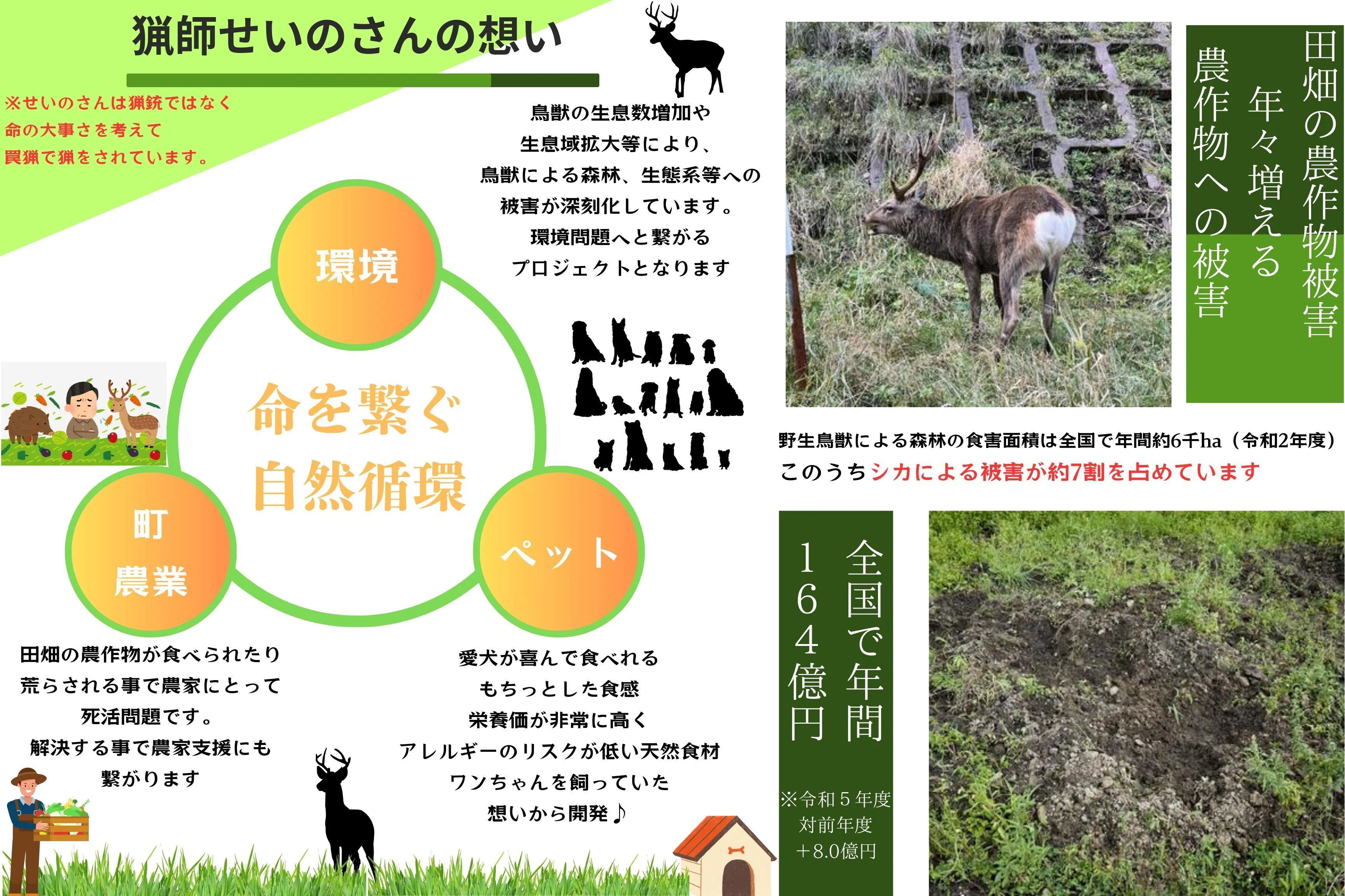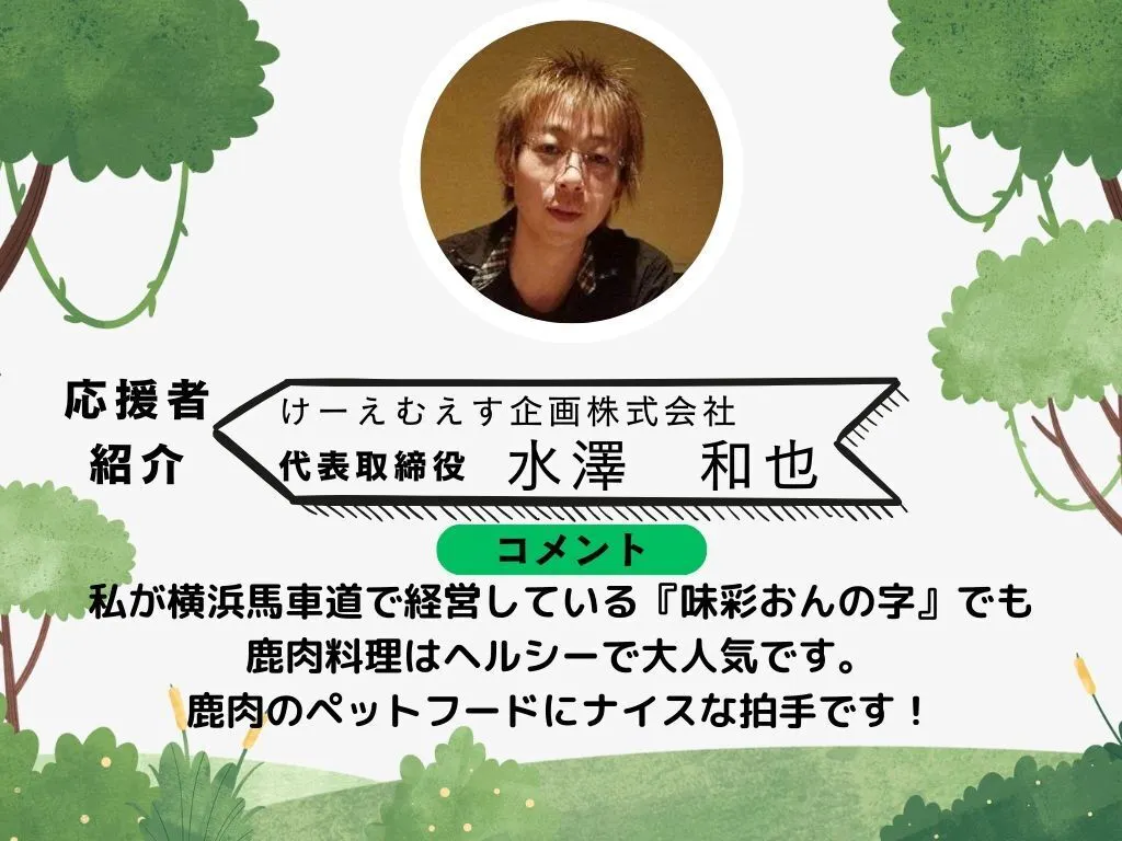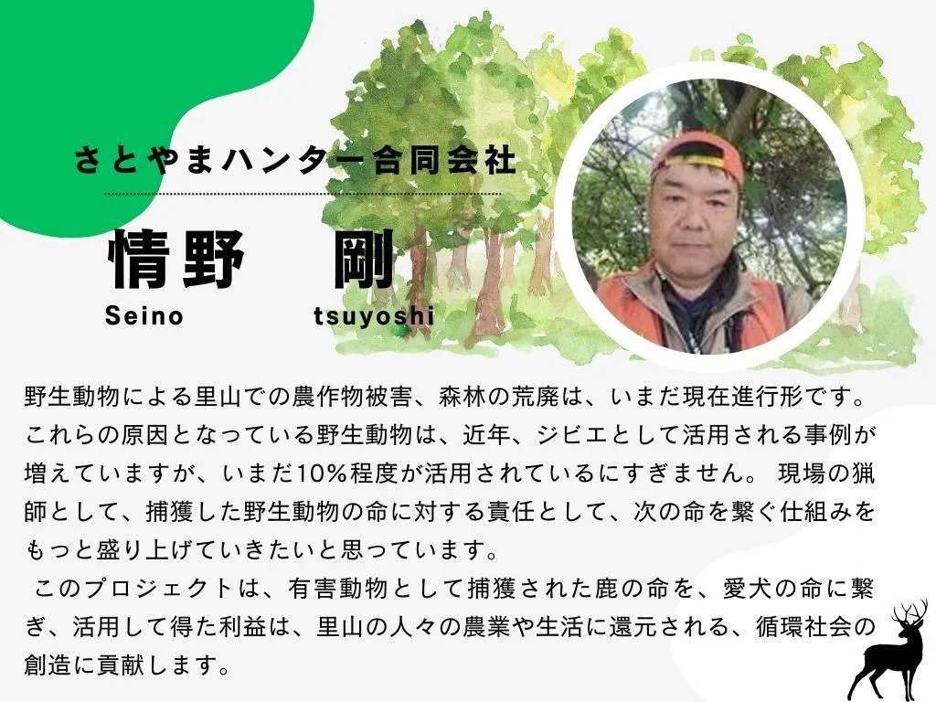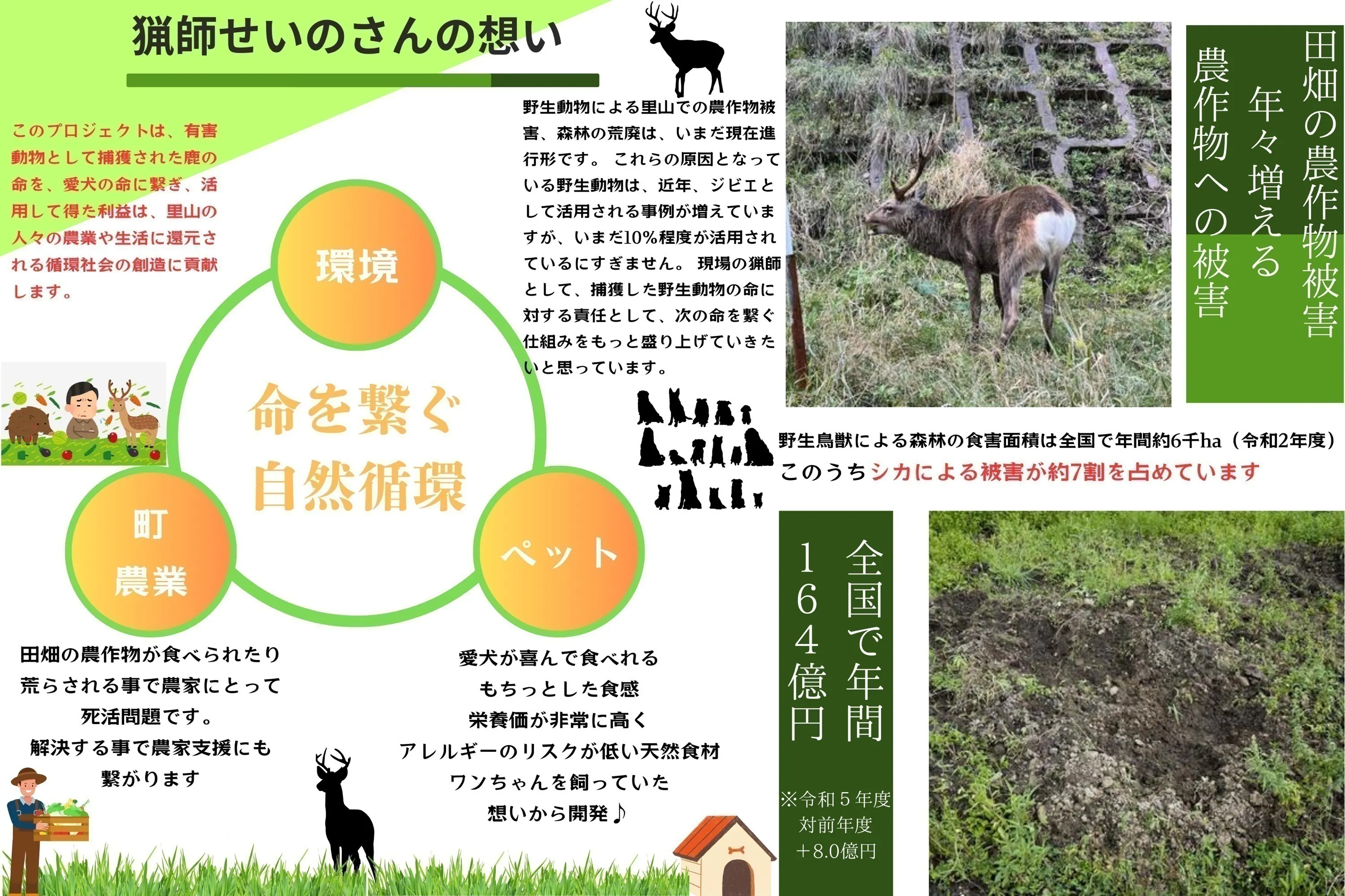 野生の鹿は、新鮮な草木を食み、渓流のきれいな水を飲み、山に守られて育った、栄養価の優れた自然の最高傑作です。広くこの素晴らしさを伝えていくことが、私の使命です。 鹿の命を次の命に伝え、犬と飼い主とが、末長く楽しく過すことを応援する商品開発を目指していきます!