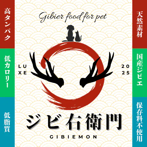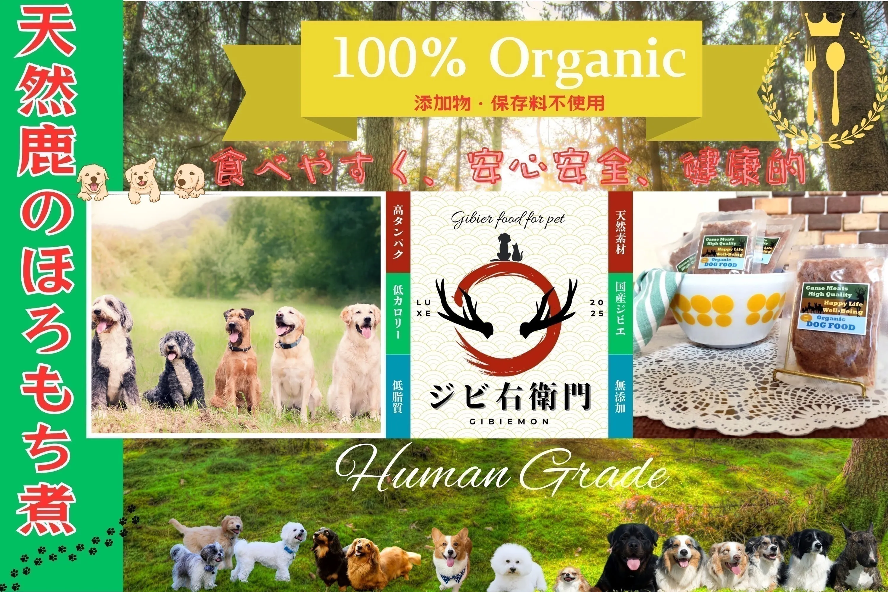『ジビ右衛門』は、新鮮な鹿肉を使用しているヒューマングレード食品です。 ペットフードの製造届出をしている施設で生産しています。 鹿肉は、高タンパク、低脂質、低カロリーで鉄分、ミネラルも豊富な付加価値の高い食品で す。この鹿肉を完全加熱殺菌処理した愛犬にとって食べやすいペット フードに加工しています。