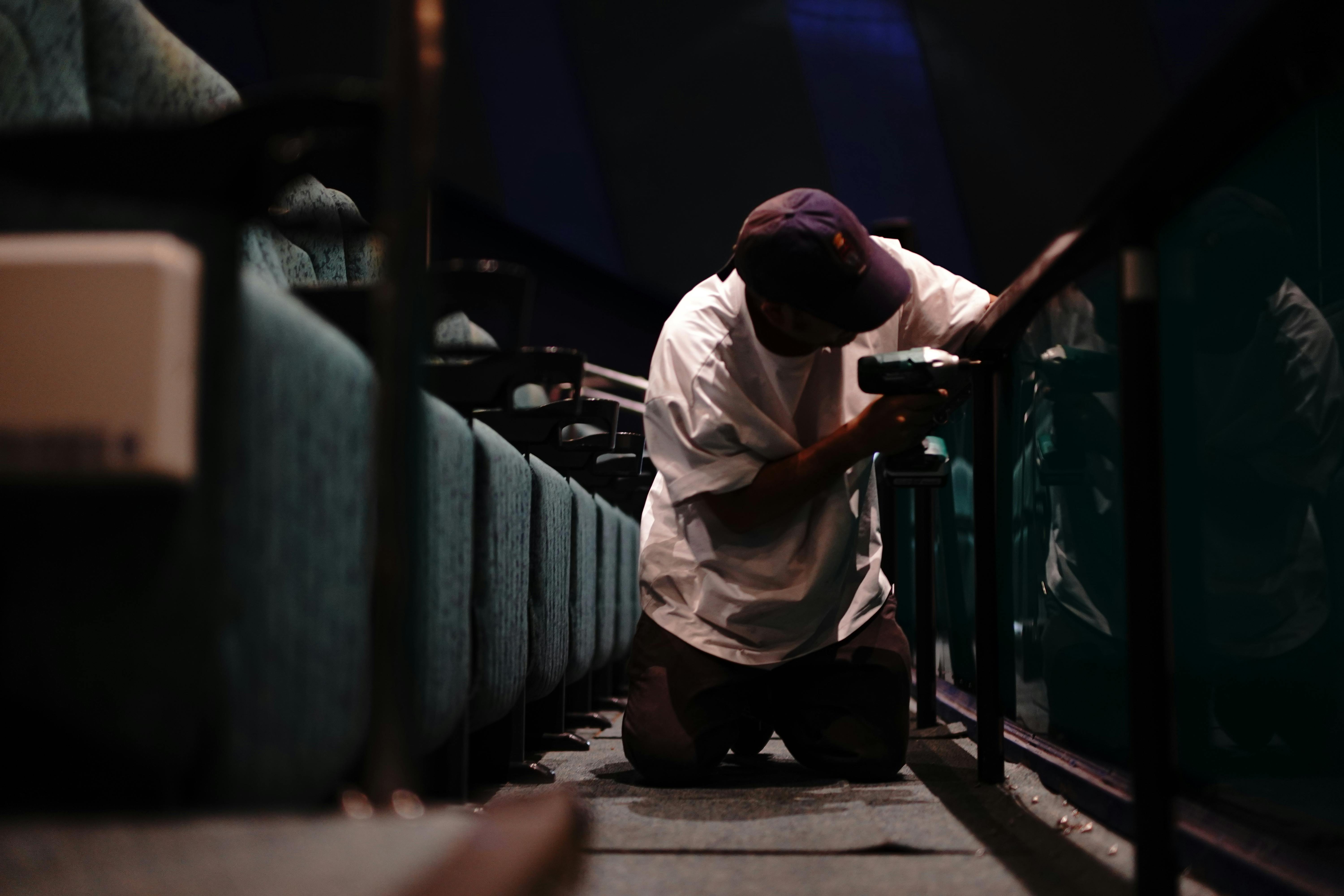 先日ご報告したスクリーンの撤去や座席札の取り外しに引き続き、丸の内TOEIではアップサイクル商品制作に向けた準備を行っています。