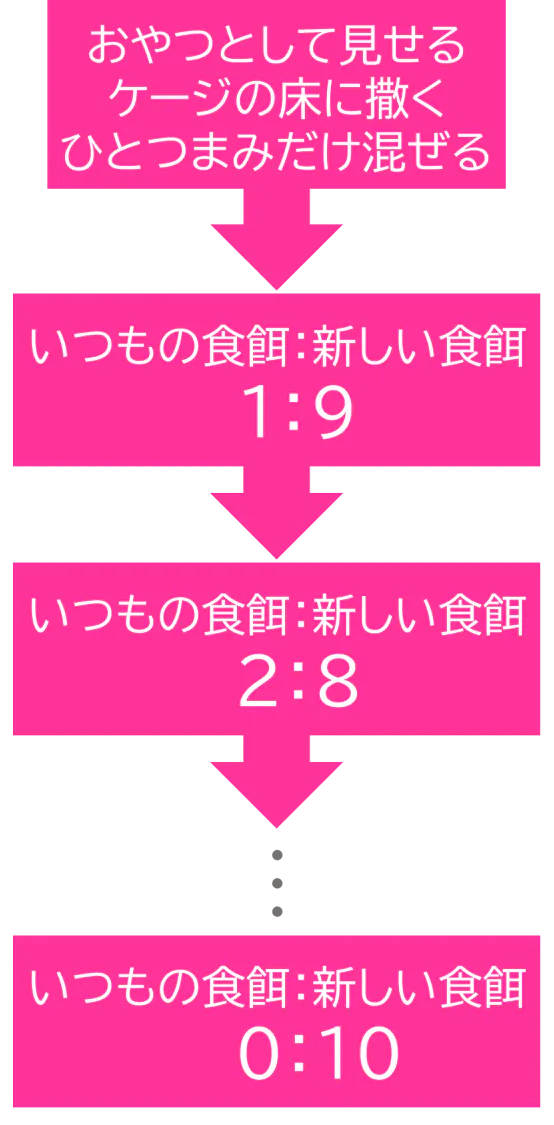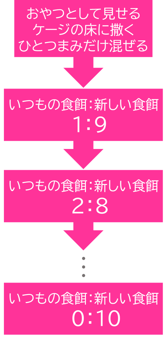 抵抗感がなくなって食べるようになれば、いつもの食餌の割合を減らしていってください。小鳥は食べたフリをすることがありますので、体重が減っていないか必ずチェックしてください。