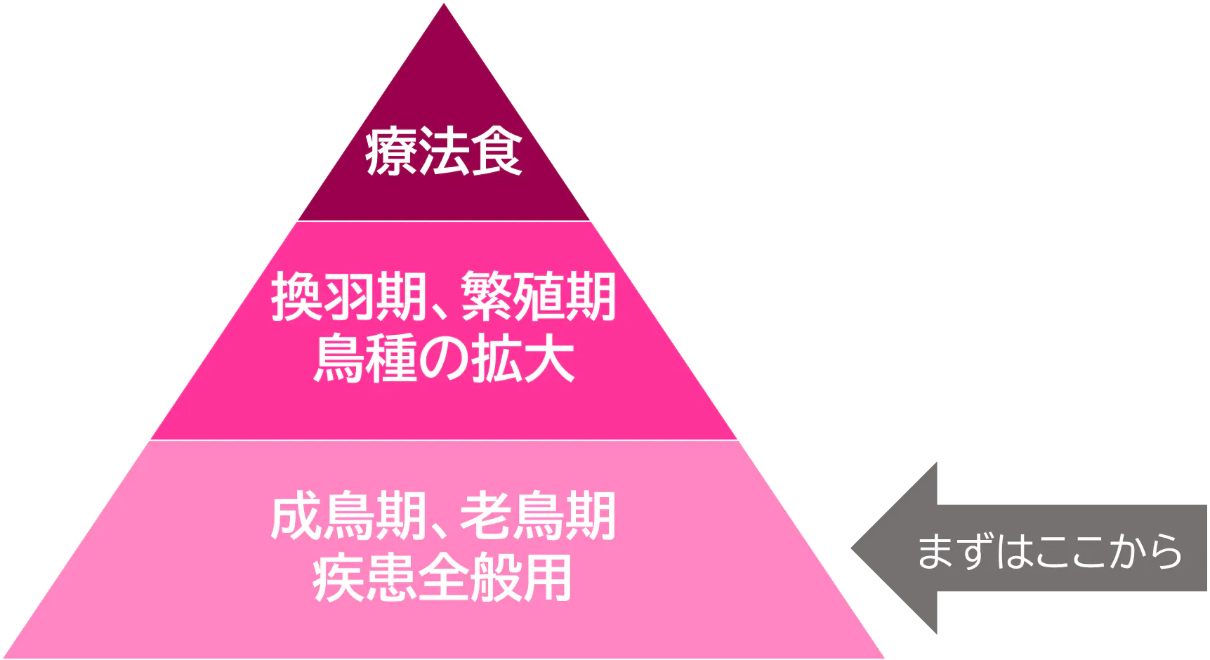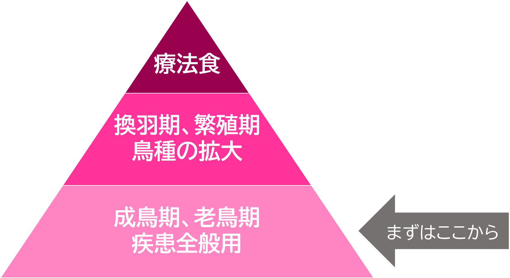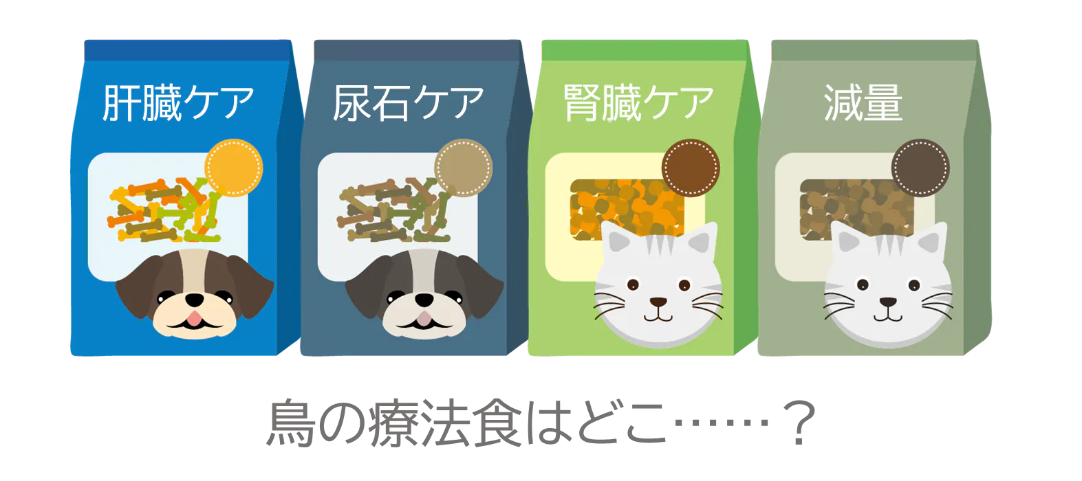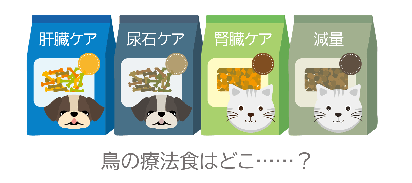 ところが、愛鳥には愛犬や愛猫のような療法食が売られていないことに気付きました。今や、ペットショップは肝臓ケアや尿路結石ケアなどといった療法食に占拠されています。しかし、そこに愛鳥用の療法食はありません。これらの経験をきっかけに、「愛鳥のための療法食が必要だ」と強く考えるようになりました。