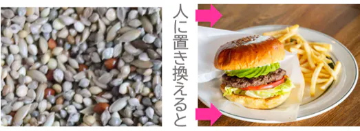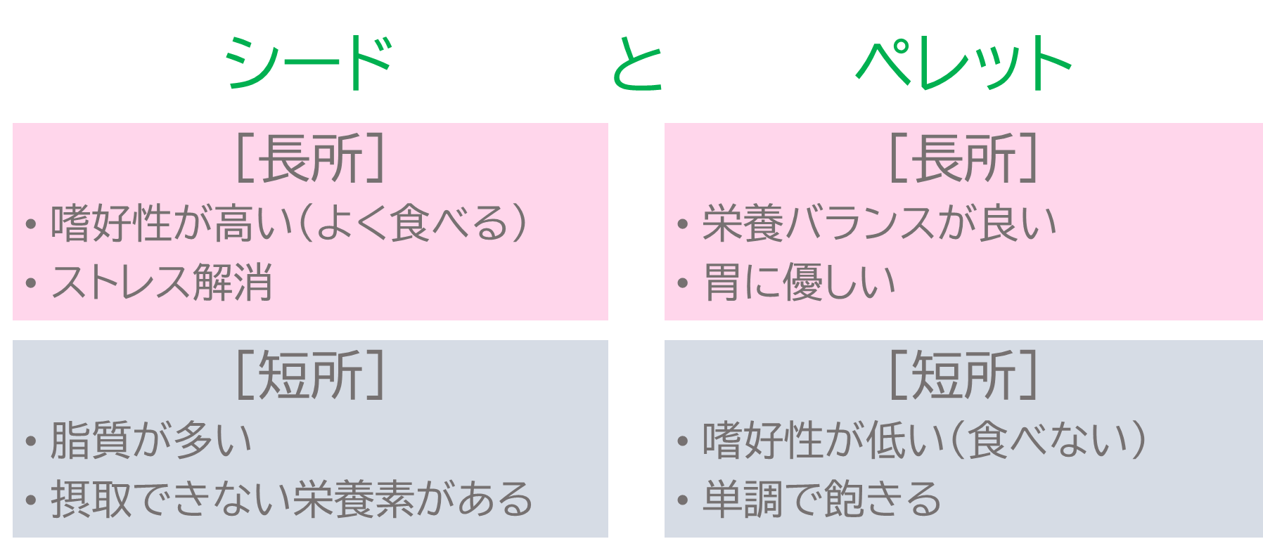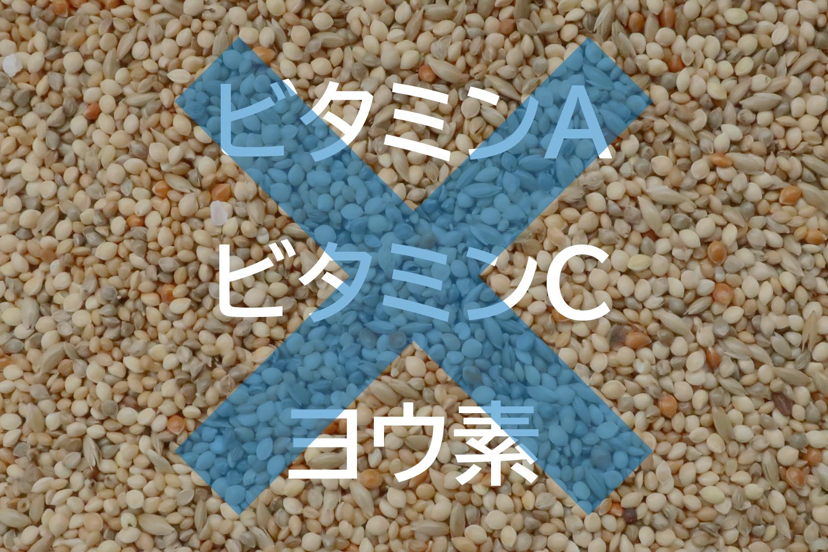 シードは一般的に想像される小鳥の食餌であり、多くの小鳥にとっては大好物です。また、シードの皮を剥くという行為は小鳥にとって楽しみの1つであり、ストレス発散となります。ところが、植物が次世代を残すためのタネであるシードは脂質が多すぎます。また、シードだけを食べさせているとビタミンCやビタミンA、ヨウ素といった栄養素が不足してしまいます。