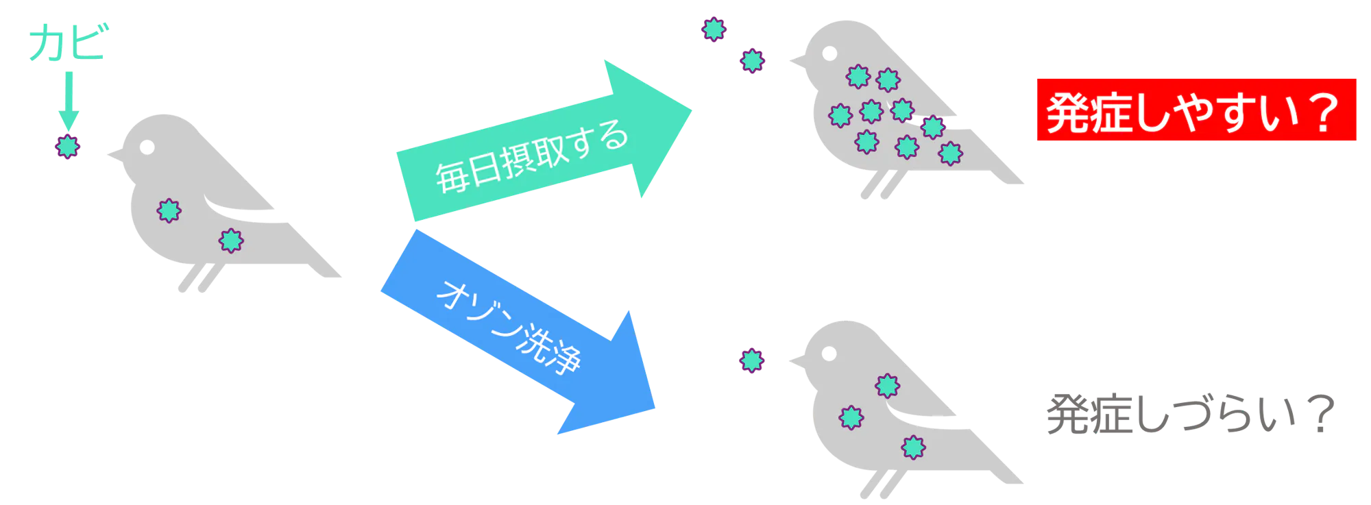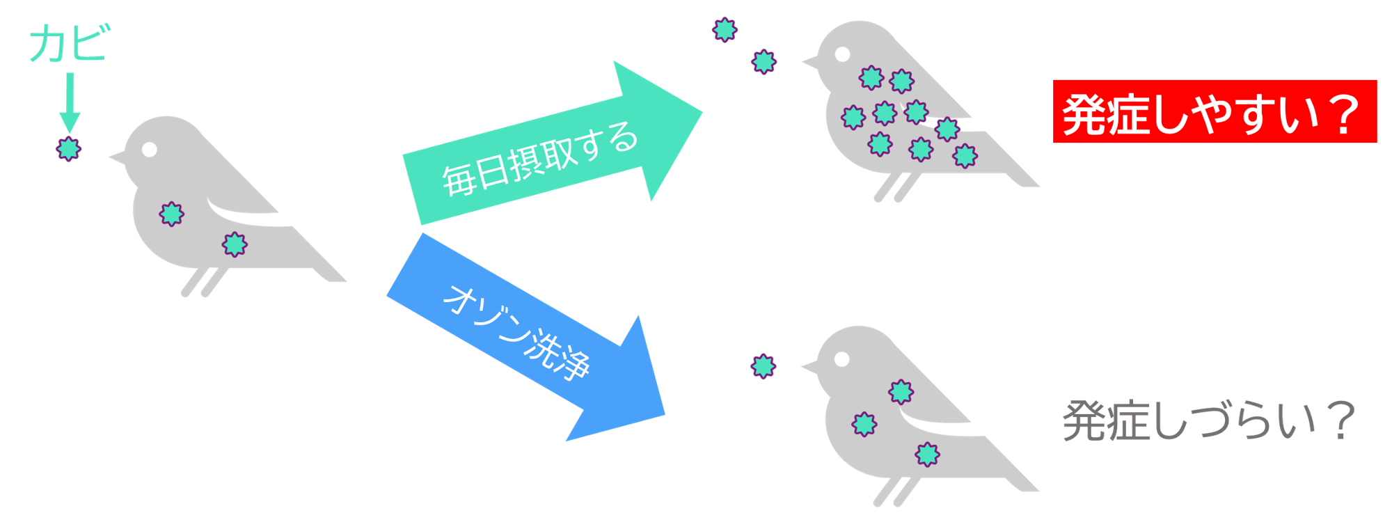 それは、毎日カビを摂取しているかどうかが重要だと感じているからです。ヒナのうちにカビに感染してしまったが成鳥になってからはカビを摂取していない小鳥と、成鳥になってからも摂取し続けている小鳥を比べると、体内に取り込むカビの量が少ないほうが病気にはなりづらいのではないでしょうか。