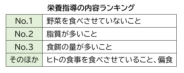 その一方で、野菜やフルーツを毎日食べさせない理由としては「毎日与える必要はないから」、「傷むのが早いから」、「手間がかかるから」というものが挙げられました。実際、病院での見学中にもっとも多かった栄養指導の内容は野菜を食べさせていないことでした。