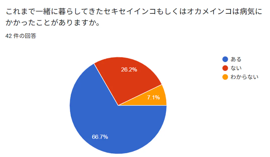 また、2024年4月15日から2024年4月21日の7日間、セキセイインコもしくはオカメインコの飼い主さんを対象にオープンチャットにてアンケートを実施しました。統計資料として扱うにはサンプル数が少ないのですが、66%の飼い主さんが何らかの病気を経験したことがあるという回答を得ました。内訳としてはメガバクテリア(マクロラブダス症)、胃腸の病気、卵巣・精巣の病気が多く挙げられました。