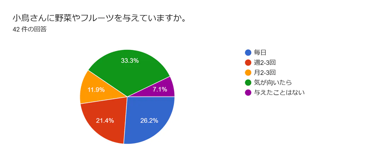 アンケート内の愛鳥に野菜やフルーツを食べさせる頻度に関する質問では、「気が向いたら与える」という回答が33%ともっとも多くなりました。次いで「毎日」、「週2~3回」と続きました。野菜やフルーツを与える理由としては「健康のため」、「日常に楽しみを与えたいから」といったものが多く挙げられました。