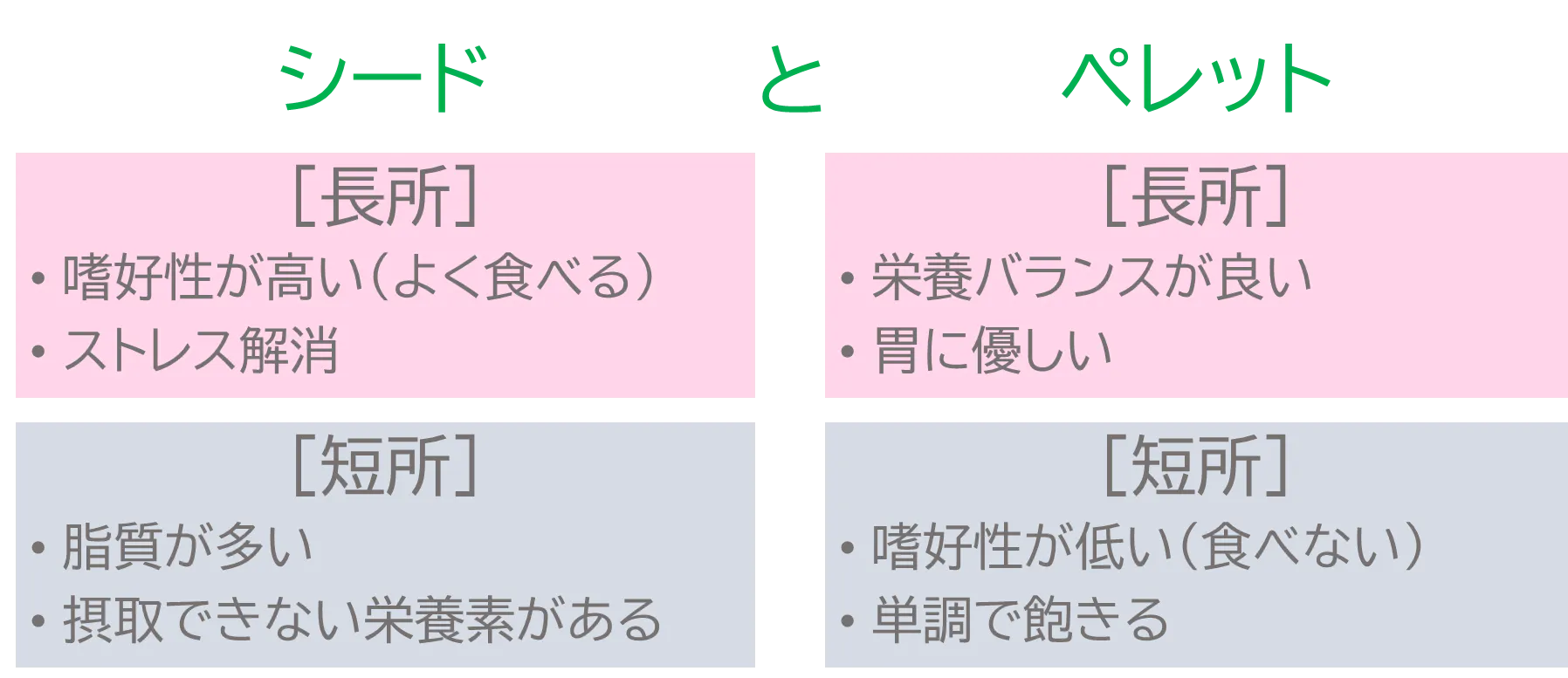 ペレットの中にシードだけでは足りない栄養素を含んでいれば、この食餌を食べさせることで栄養素の問題は解決できます。また、ペレットとシードの混合食であれば、シードの皮を剥く楽しみも維持されます。獣医療の発達に伴い小鳥の寿命は延長しつつありますが、その長寿命をサポートするためにはペレットが必要不可欠です。