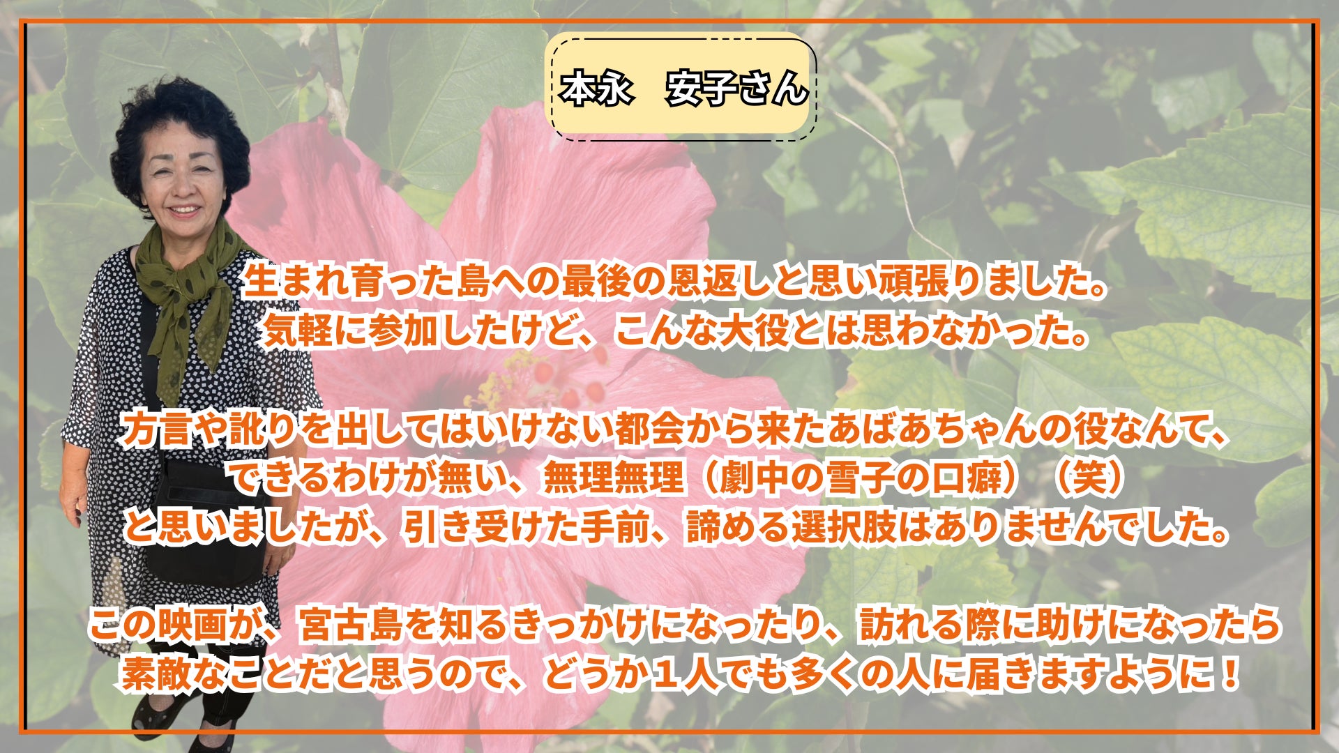 この映画を通じて、宮古島の魅力と人の温かさがもっと広がることを願っています。