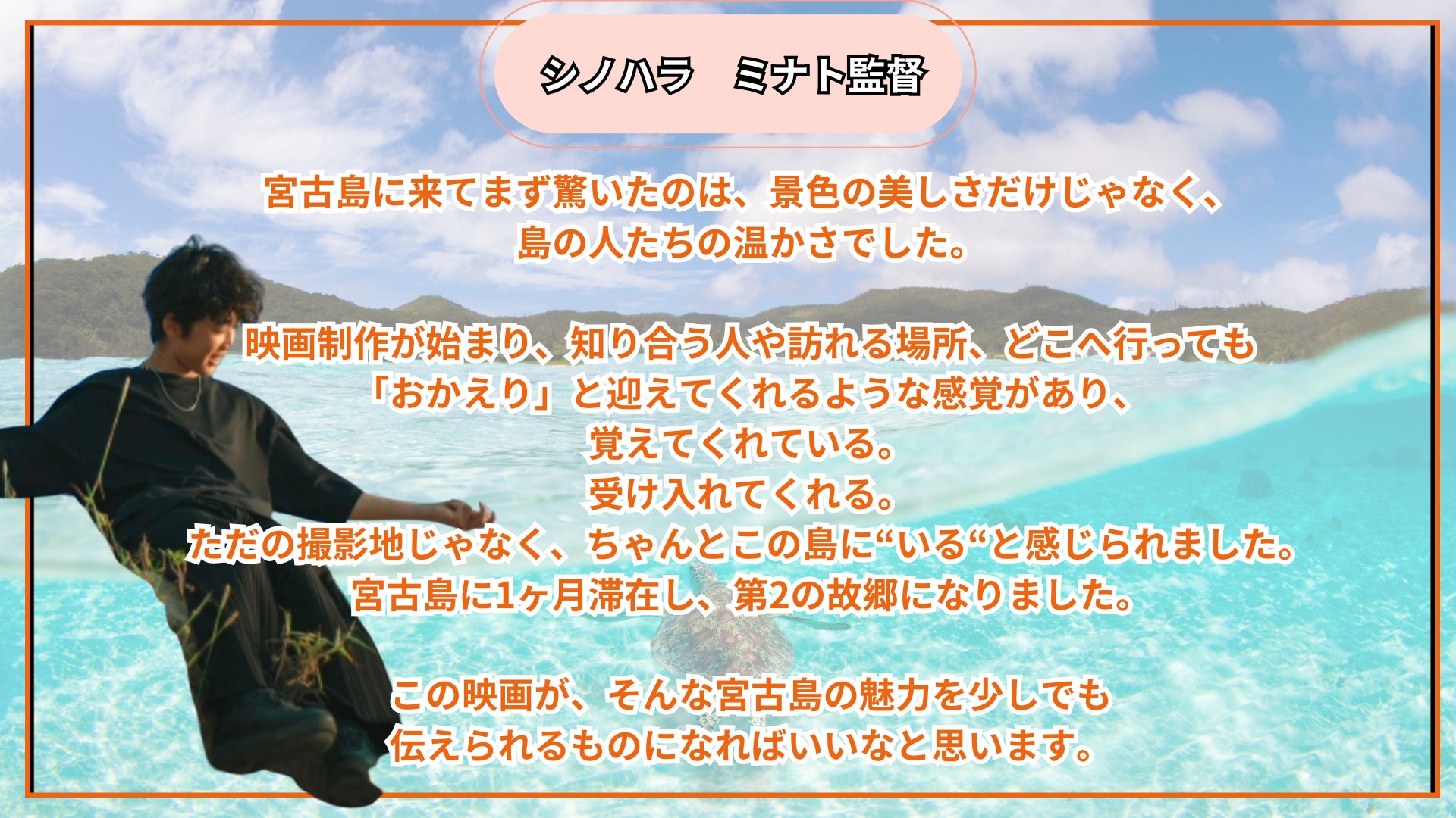 それを映画という形で表現し、1人でも多くの方に宮古島の魅力を届けたいと考えています。
