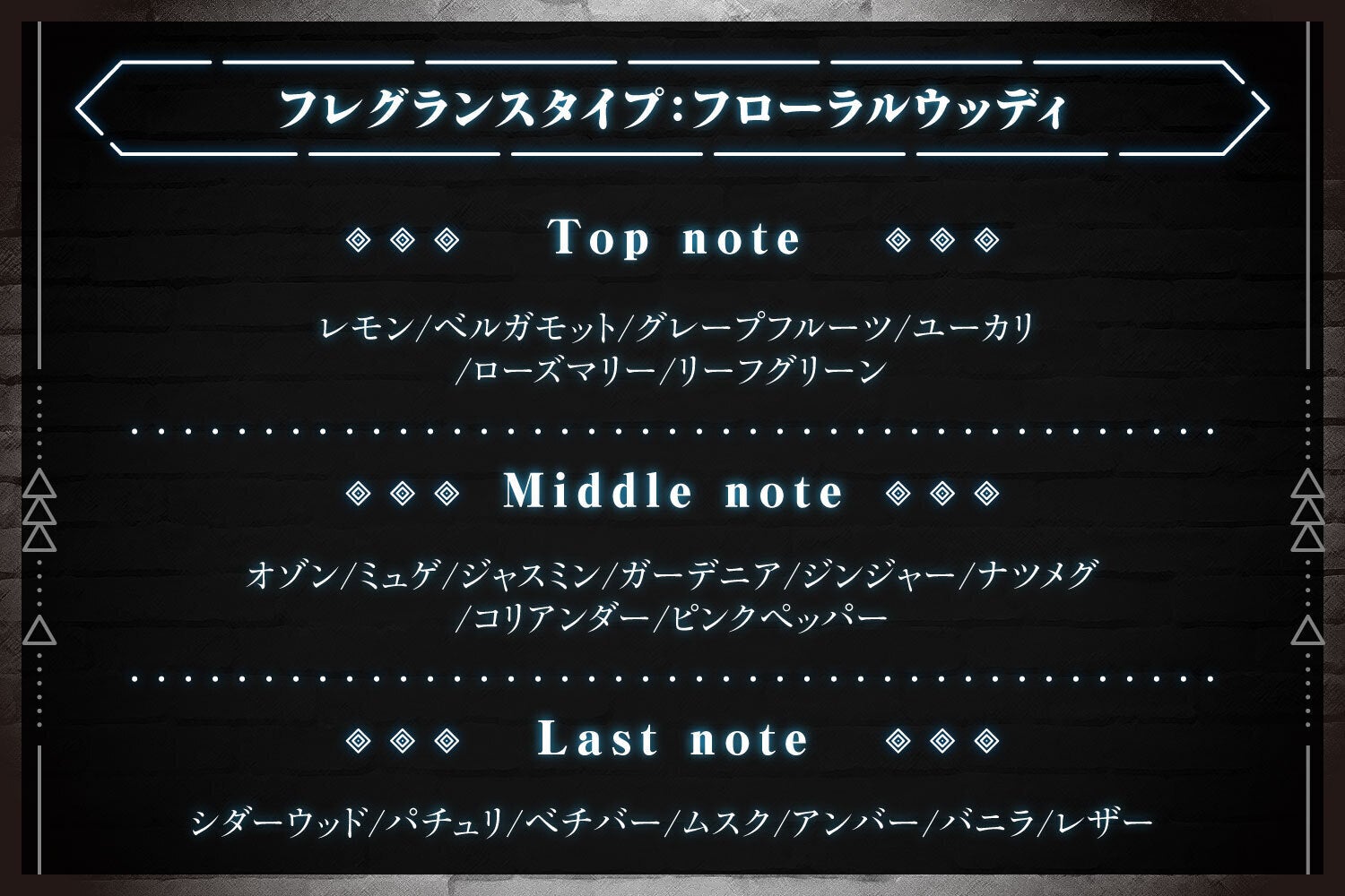 ラストには奥深いウッディの温もりが広がり、エレガントな香調を感じさせます。