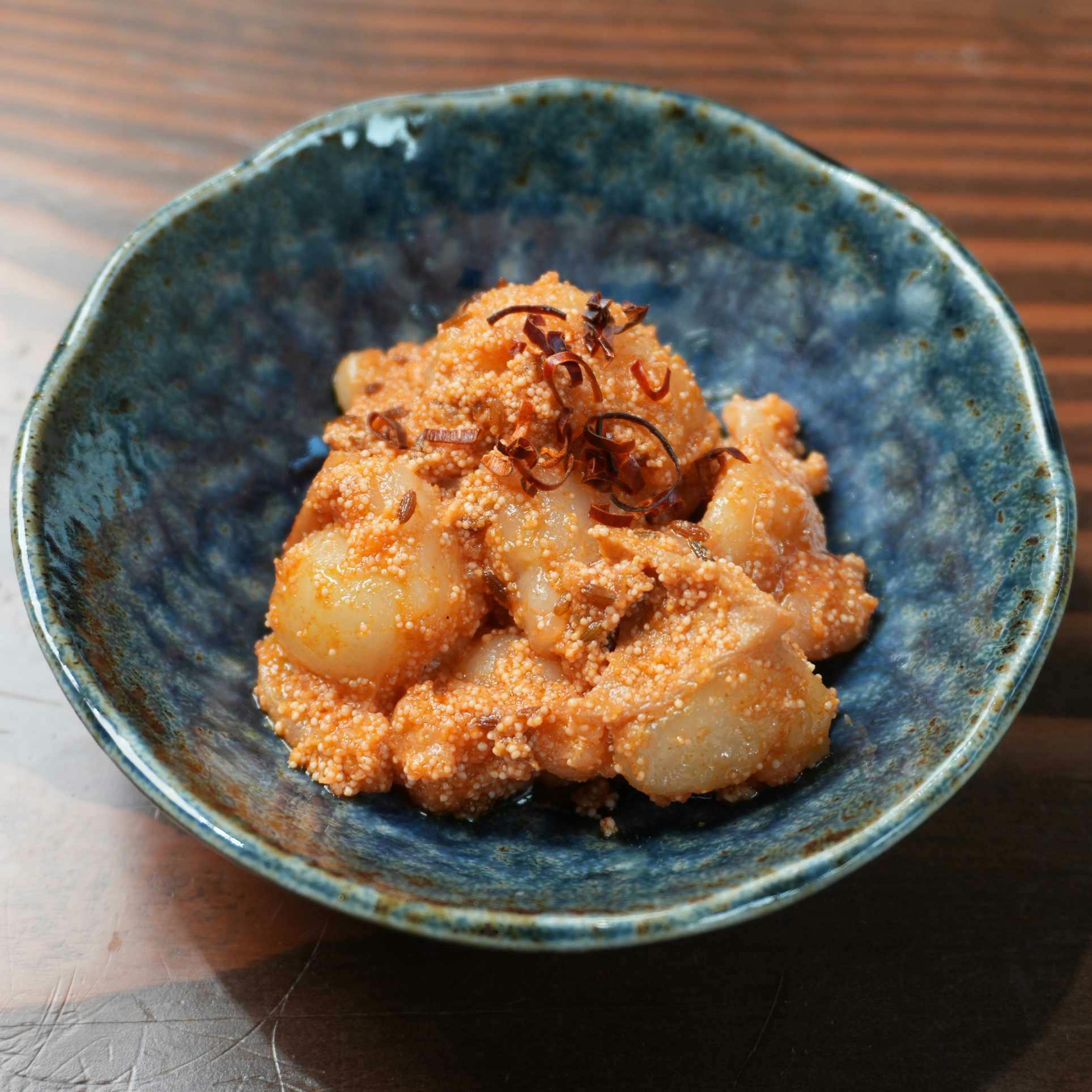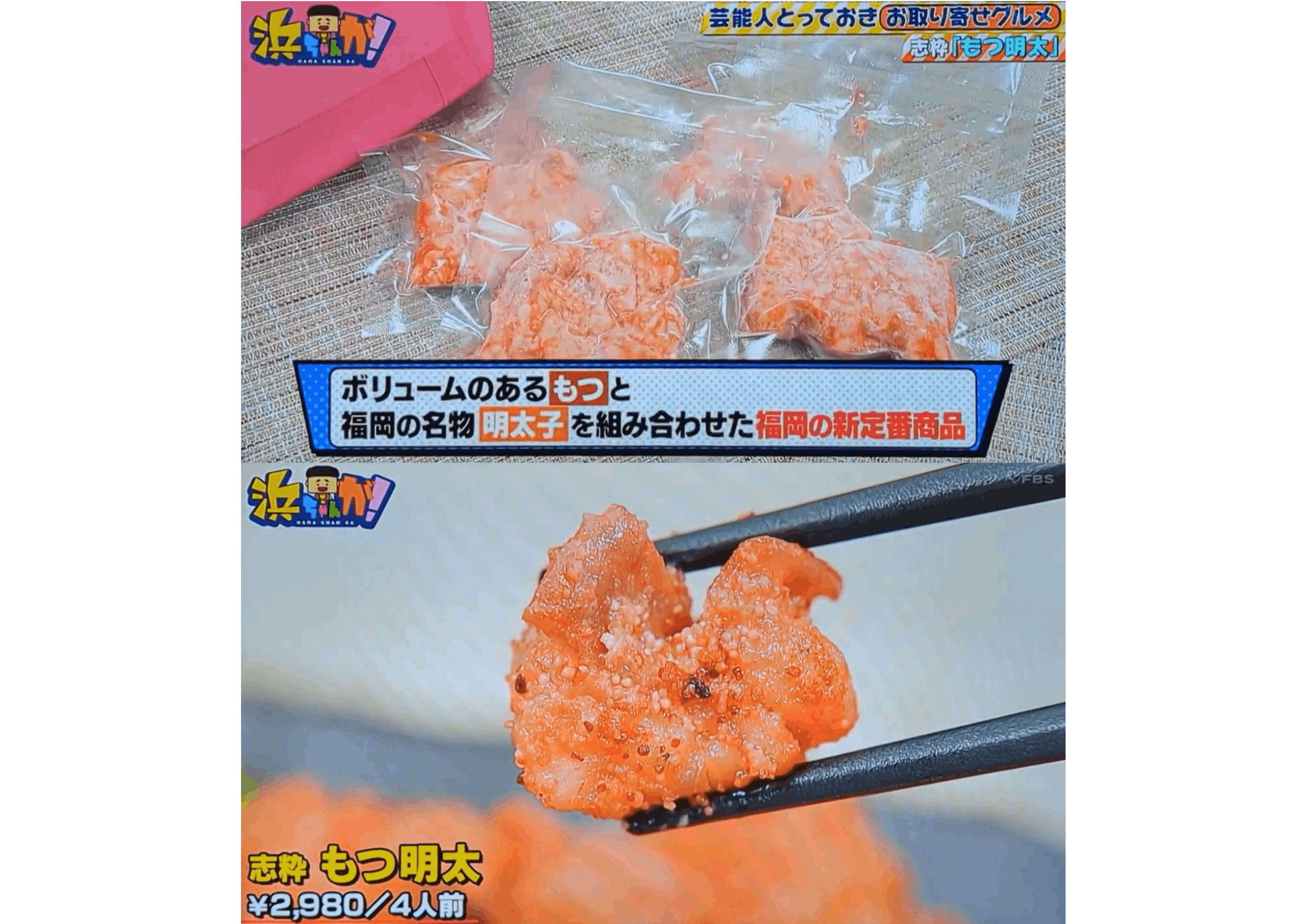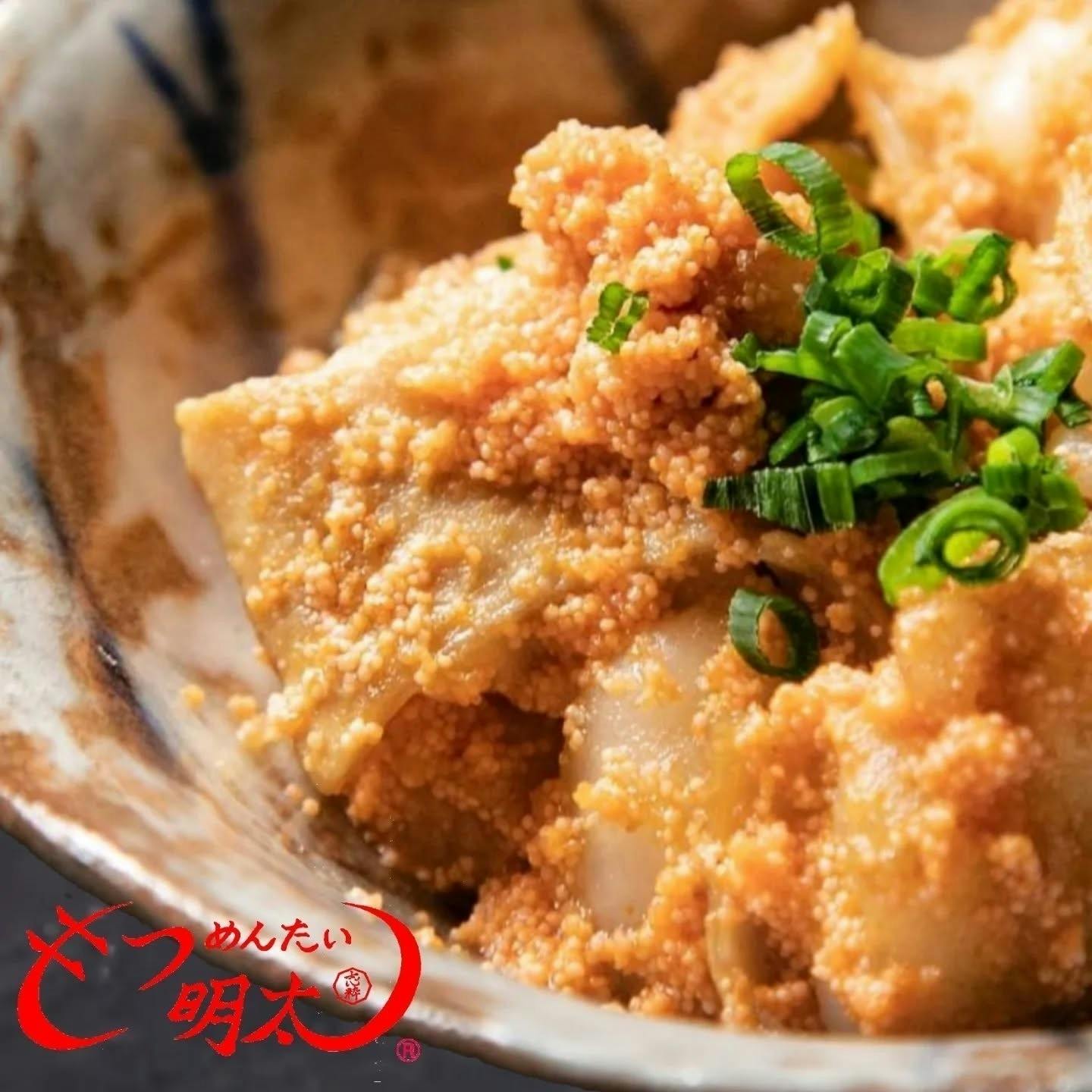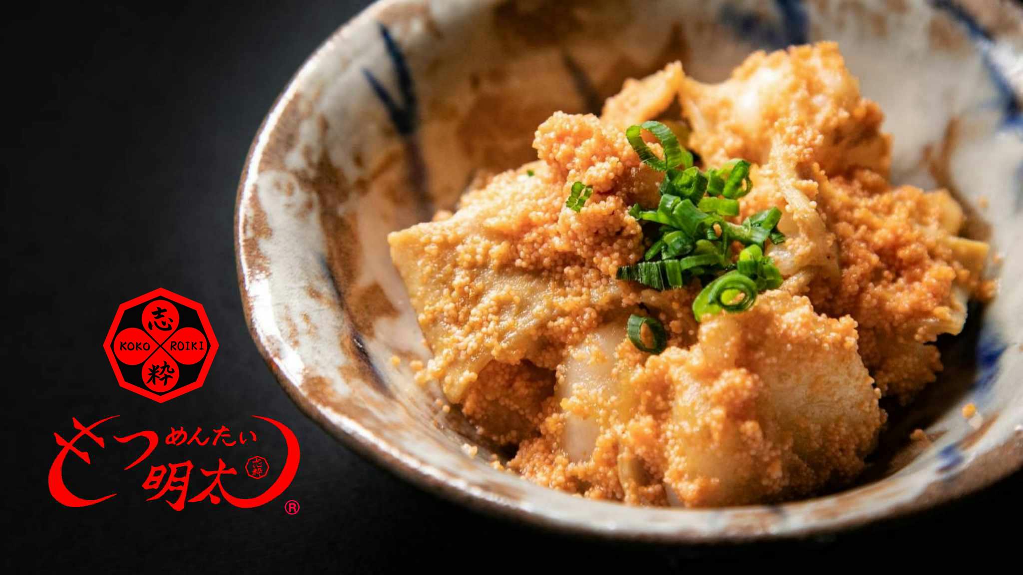 福岡の定番グルメの一つといわれるもつ鍋の素材の「もつ(小腸)」と、もう一つの定番グルメ「明太子」をかけ合わせた”粋な共演”の絶品グルメ。