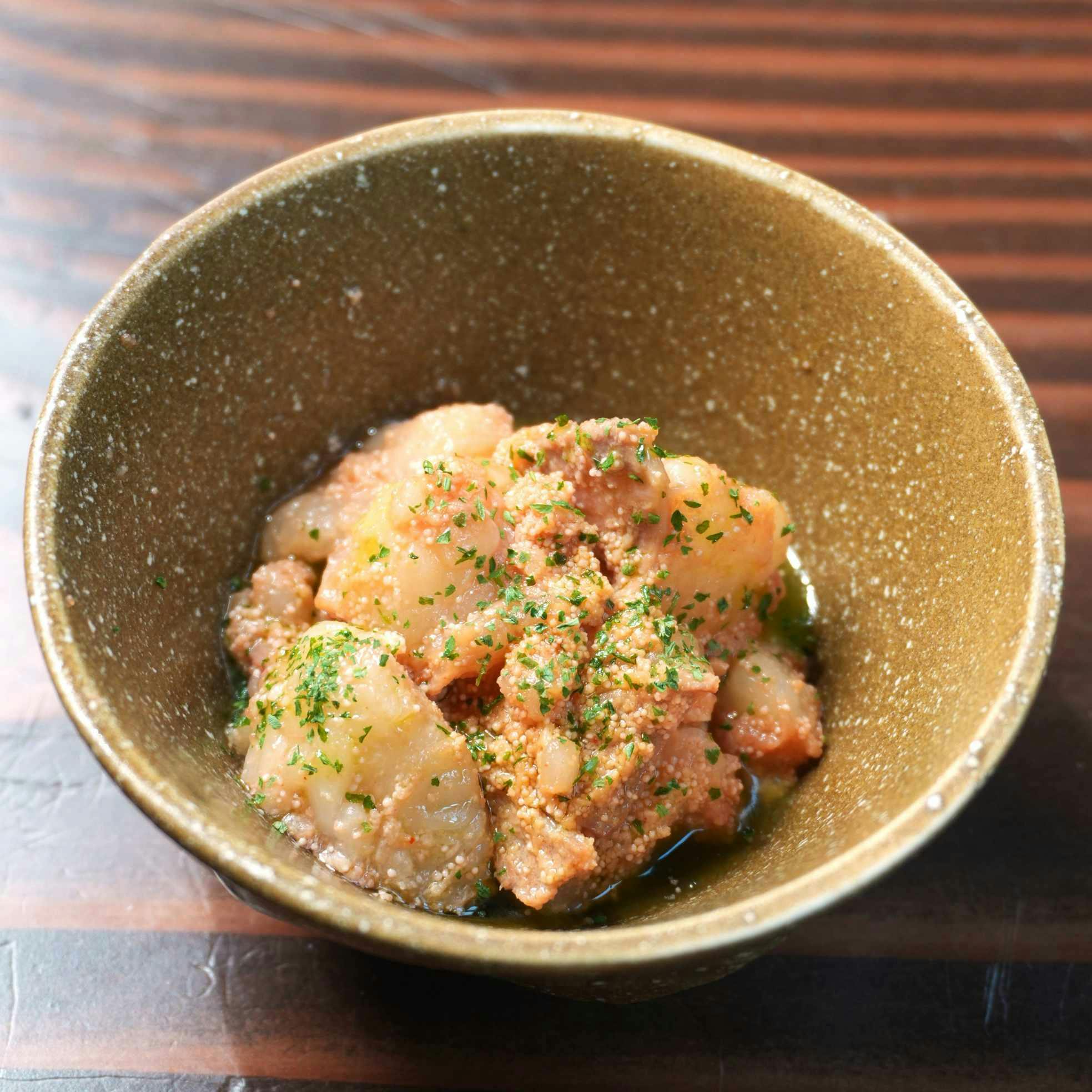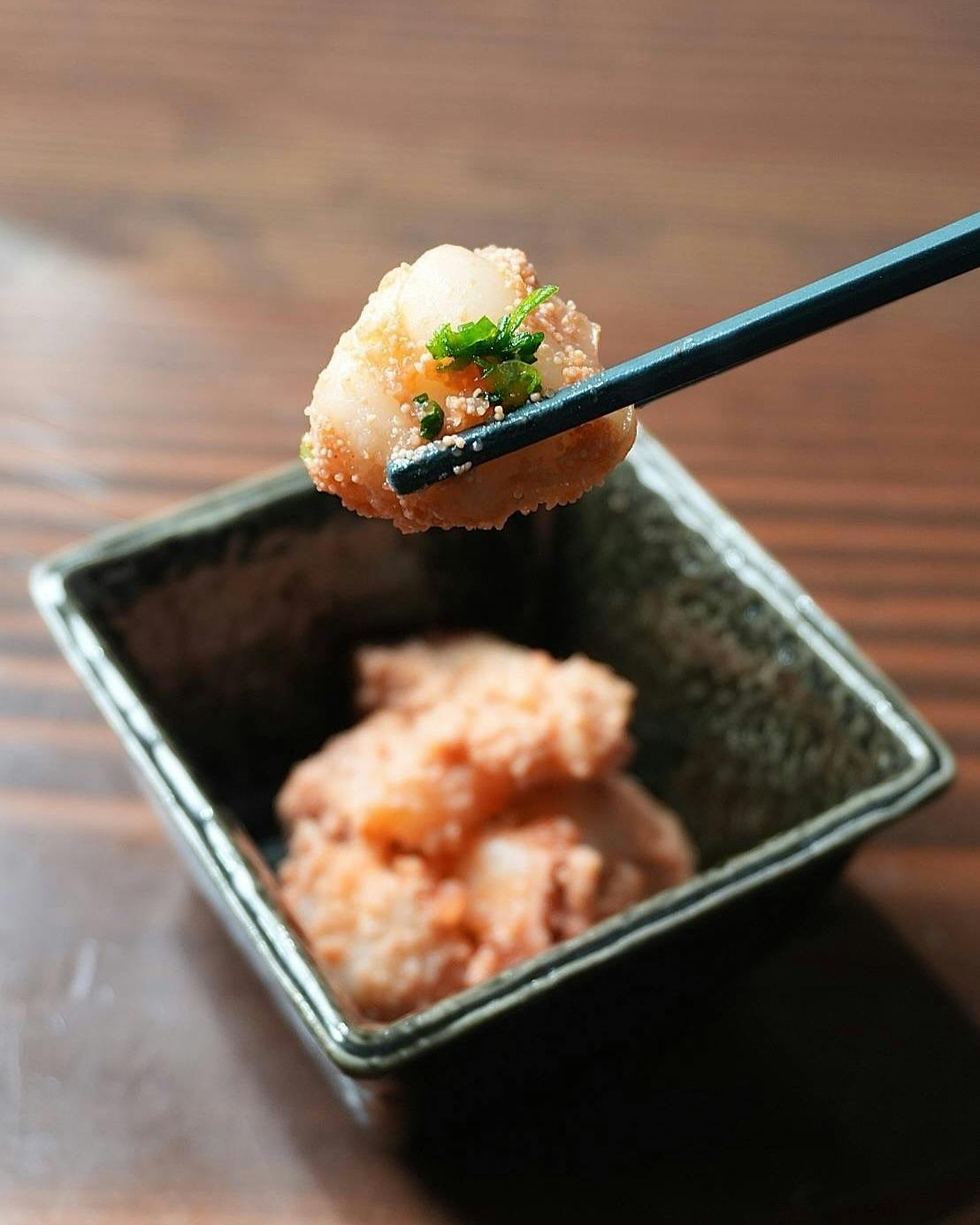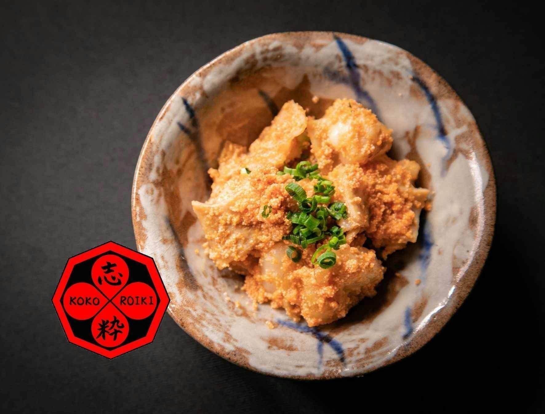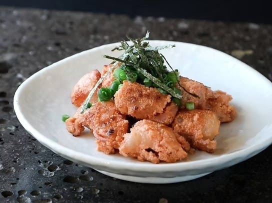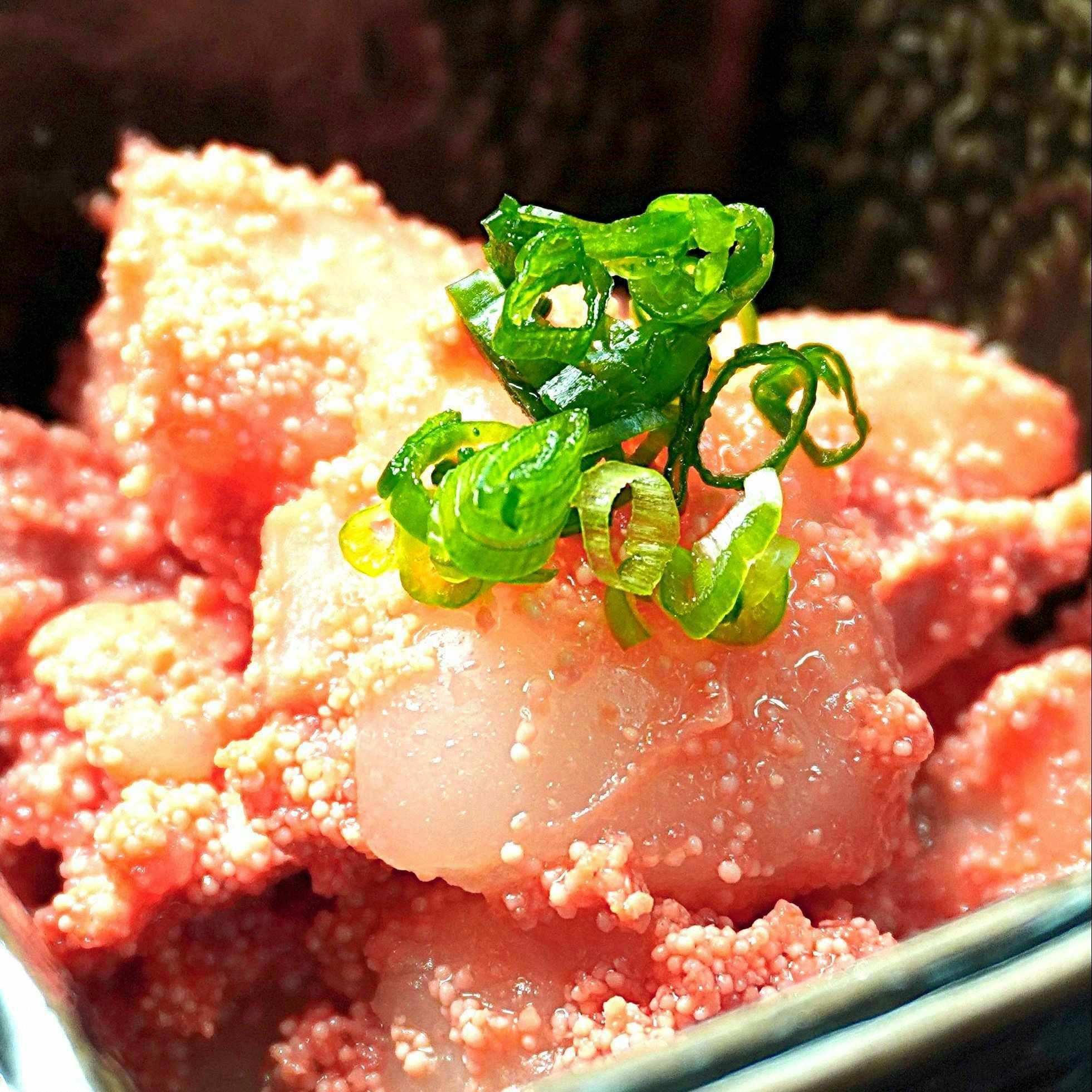 福岡の定番グルメの一つといわれるもつ鍋の素材の「もつ(小腸)」と、もう一つの定番グルメ「明太子」をかけ合わせた”粋な共演”の絶品グルメ。