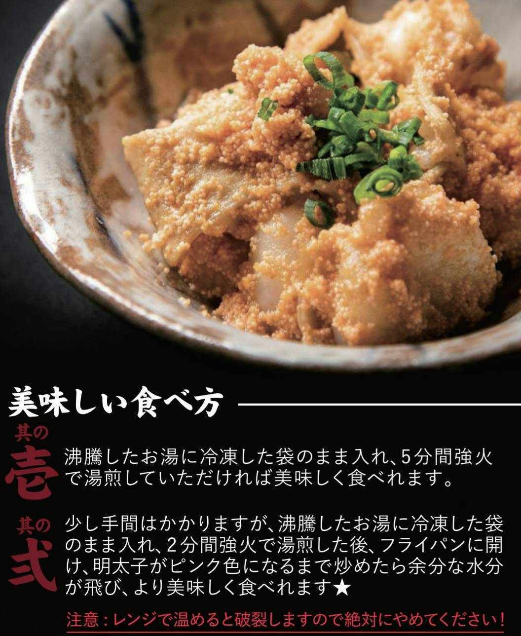 必要な時に必要な分だけの「もつ明太」を湯煎し、封を開けてそのままフライパンで炒めるだけで、無駄なく手軽で簡単に至高の「もつ明太」をいただくことができます!