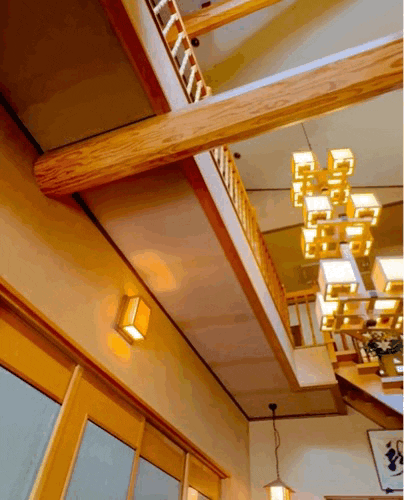 玄関には、特注で作られた巨大な木製の照明が輝き、職人の技術が詰まったデザインが空間を包み込みます。