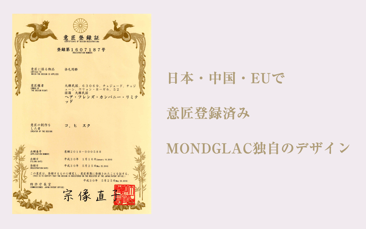 「MONDGLAC」の特殊なデザインは日本・中国・EUで意匠登録済み。同じ機能、同じデザインは他のコームにはありません。