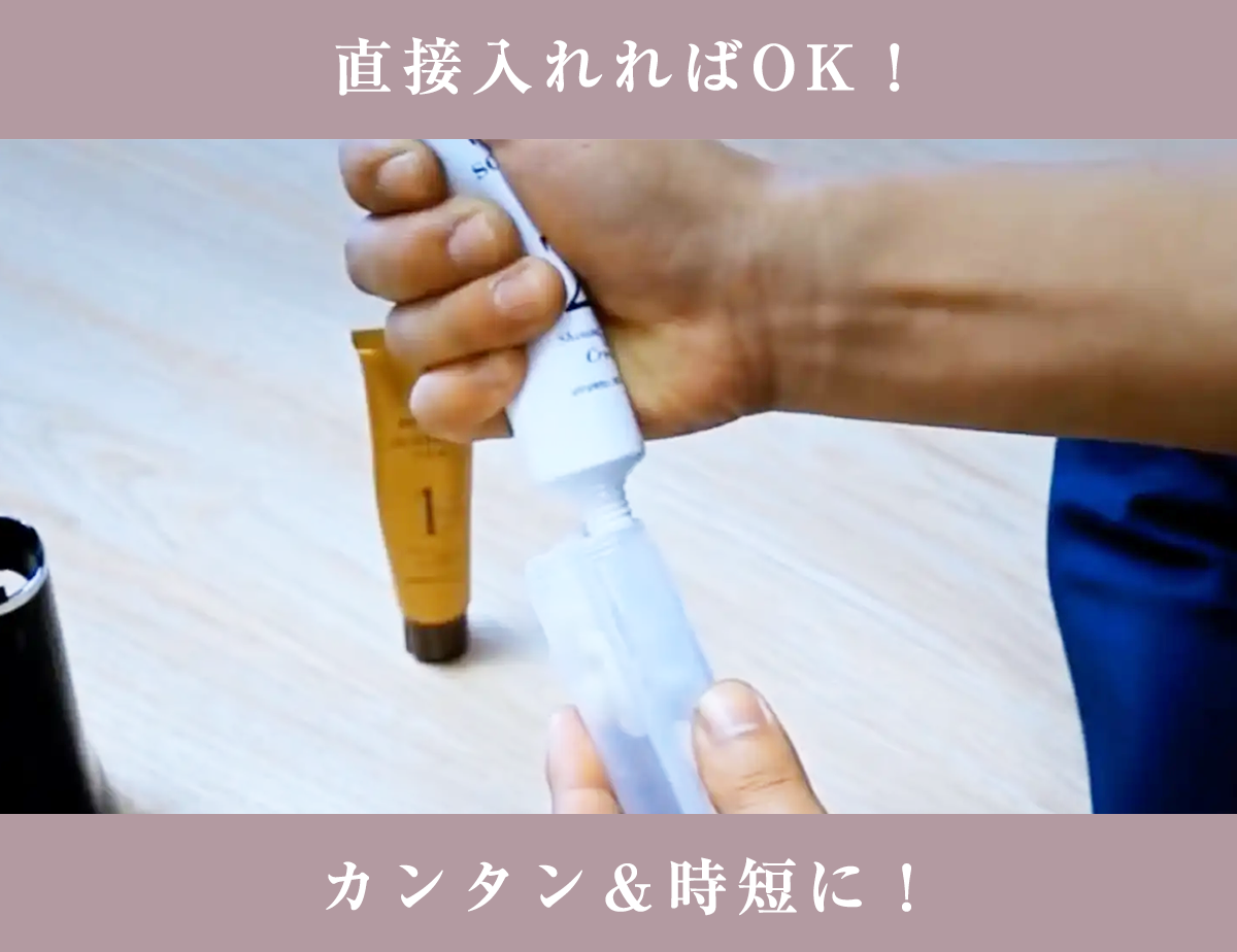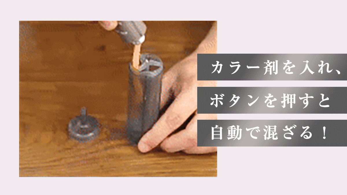 ボタンを押すと自動で混ざり合い、コームの中から噴出されるので、セルフカラーの準備が楽チンになります。