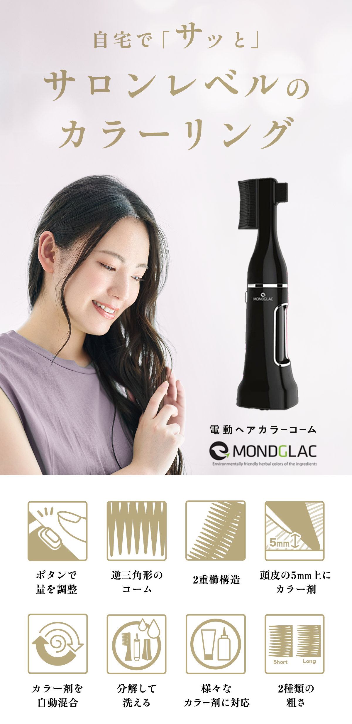 実際にあったセルフカラーのお悩みを収集し、見事に解決したのが、電動ヘアカラーコーム「MONDGLAC」です。