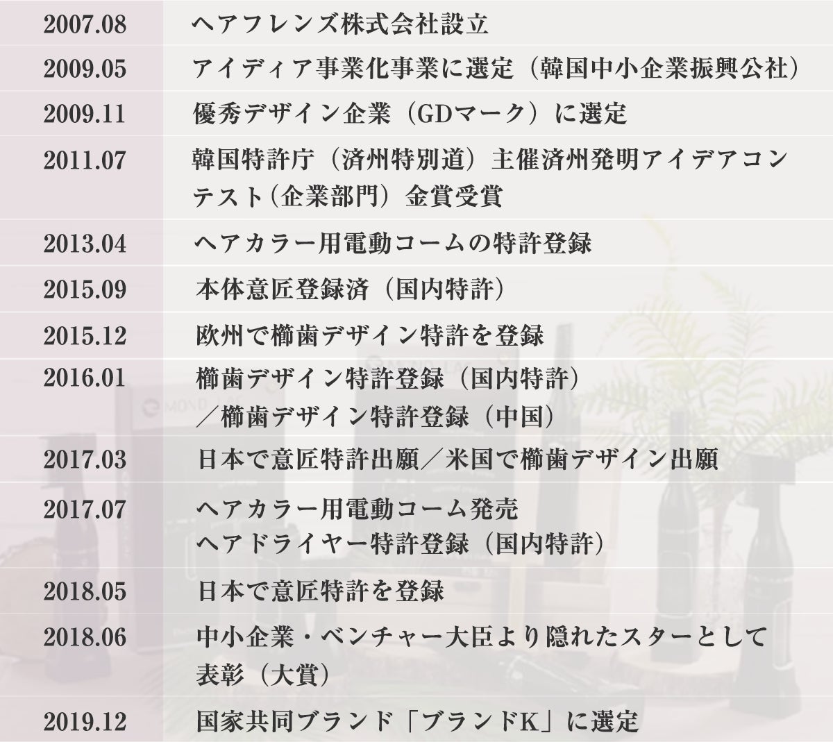 Hair Friendは、染毛用ヘアブラシの製造・販売および新技術の開発を行っている韓国の会社です。2018年には、ヒドゥンスターMBC特別生放送公開オーディションというTV番組で211の他社製品を抑えて最優秀賞を受賞しました。