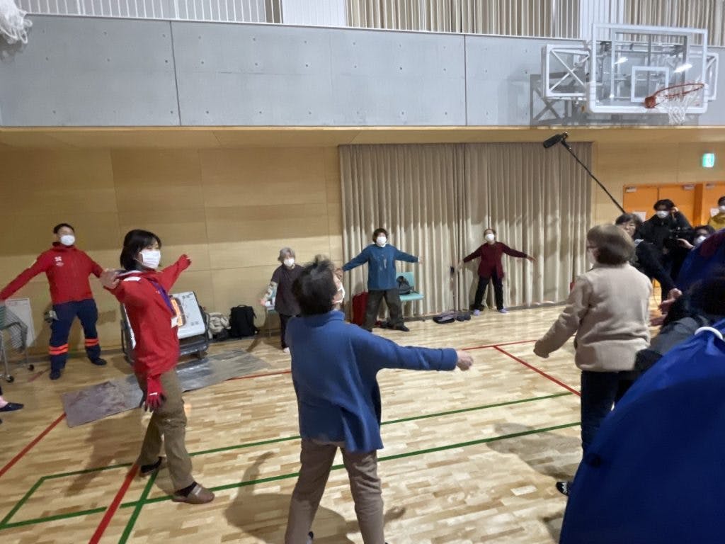 ある避難所では、急激に体を動かさなくなることで体の機能が低下してしまい、健康問題にいたる生活不活発病を防ぐために、ラジオ体操を実施。市役所からは「午前に開催したら好評だったから午後もぜひ開催したい、手伝ってもらえないだろうか」と相談を受け、避難者とともに空飛ぶ捜索医療団のスタッフも体を動かしました。