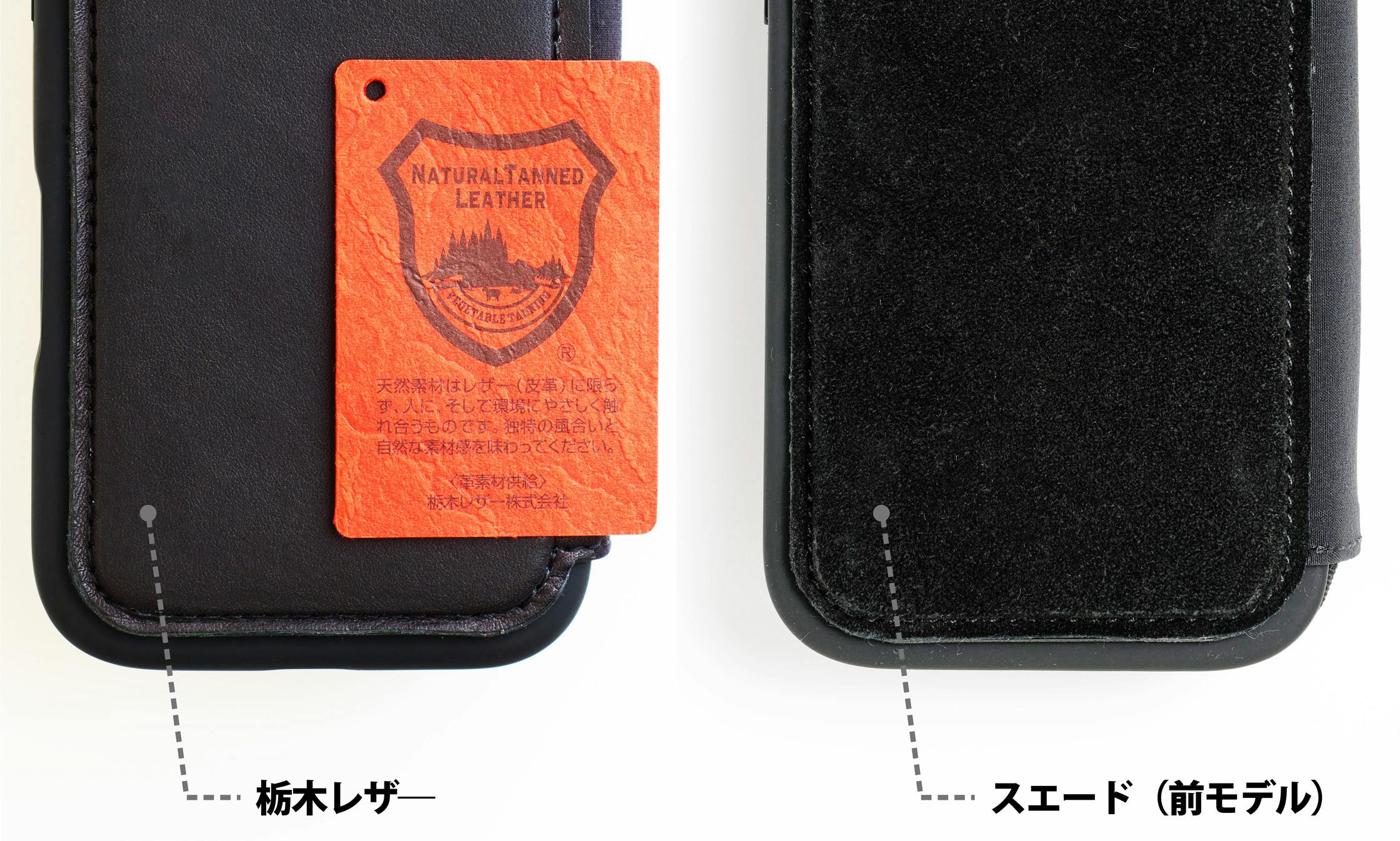 ケース背面には、世界に誇る最高峰の天然素材「栃木レザ―」を使用。フルベジ