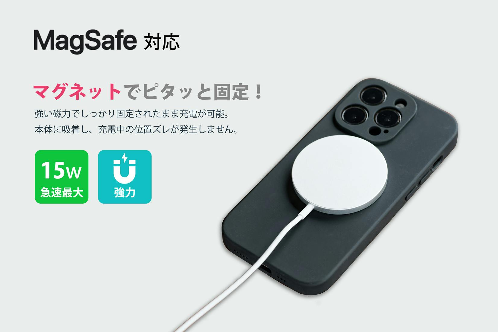 MagSafe充電器をハードケース背面に置くと磁石でピタっと貼り付きますので、位置が合わずに充電できていなかった、という失敗がなくなります。最大15Wで充電できますので、MagSafe対応の充電器としては最速です。