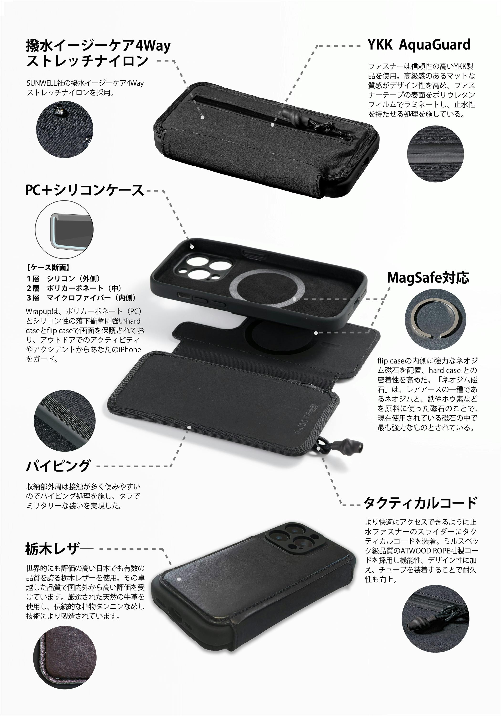 ・素材 :ストレッチ素材、栃木レザ―(外装) /PVC(内装)/ シリコン、ポリカーボネート、マイクロファイバー(ケース)・ファスナー :YKK AquaGuard(止水ファスナー)