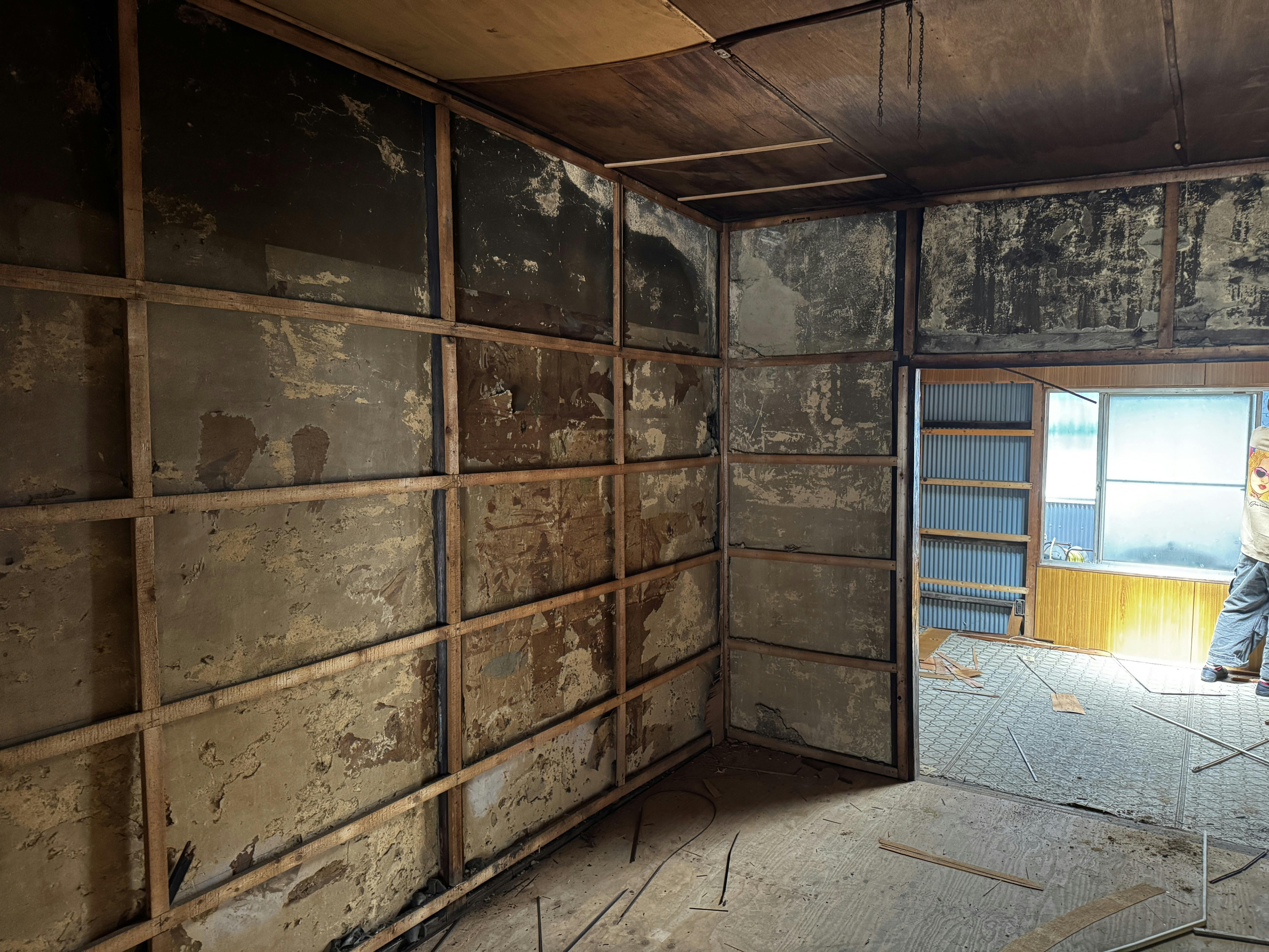 壁はほぼ土壁が出てきたので、あとは天井をどこまでめくろうか??