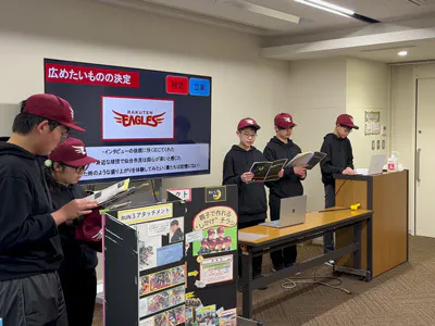 地元仙台の子供たちは「楽天イーグルスのファンづくり」から課題を導き出して、楽天野球団の広報担当とコンタクトを取り解決策を導き出していました。