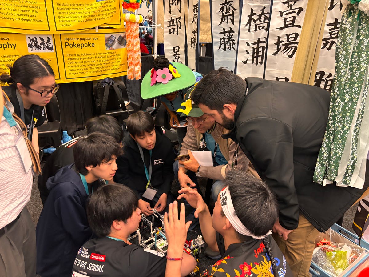また、ブースには大会の審査員がロボットデザインやプロジェクトについてもっと詳しい内容をヒアリングに訪れ、それもひっきりなしに来るもんですからメンバーは嬉しくて流ちょうに説明していました。大会の緊張感から解放されてとても楽しそうに言語の垣根を越えて交流している姿に胸が熱くなりました。