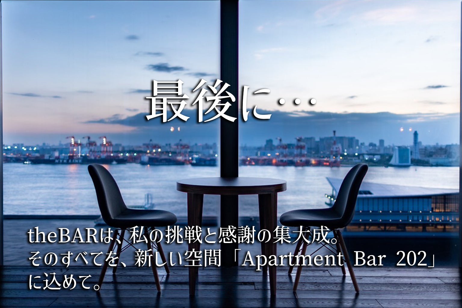 これまでの挑戦と経験、そして皆さまとの思い出を胸に、新たな隠れ家バー「Apartment Bar 202」への挑戦が始まります。
