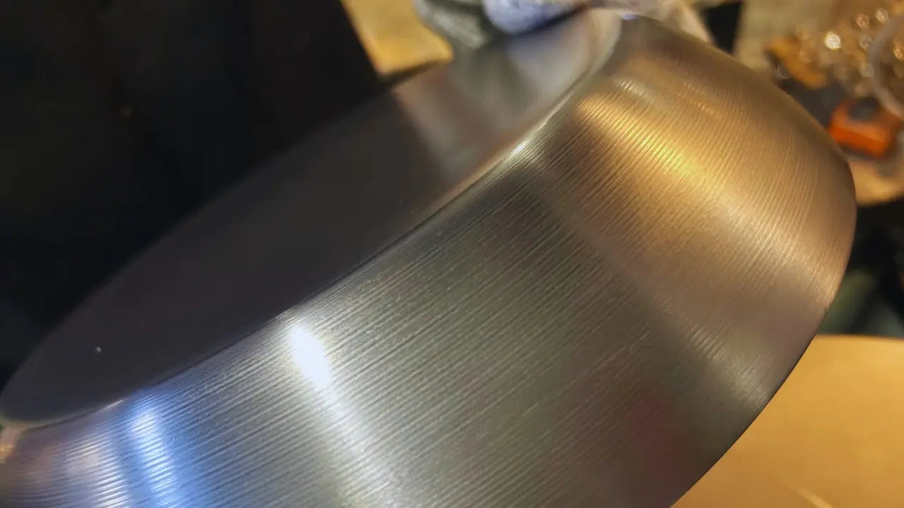 ① 巨大なプレス加工機で打ち抜いた金属板を、「へら絞り機」で薄く延ばしていきます。