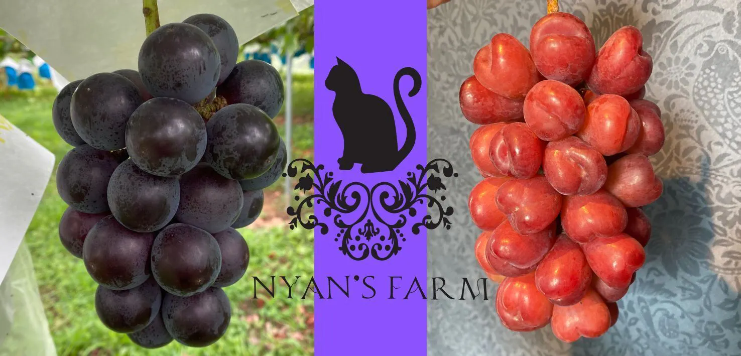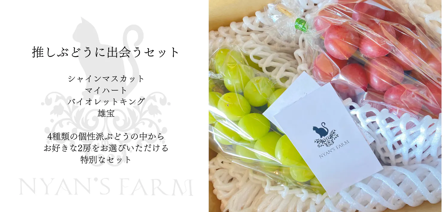 マイハートのかわいさ。バイオレットキングの気高さ。雄宝の上品さ。そして、シャインマスカットの王道感。にゃんずファーム自慢の4種の個性派ぶどうの中から、お好きな2房をお選びいただける特別なセットです。