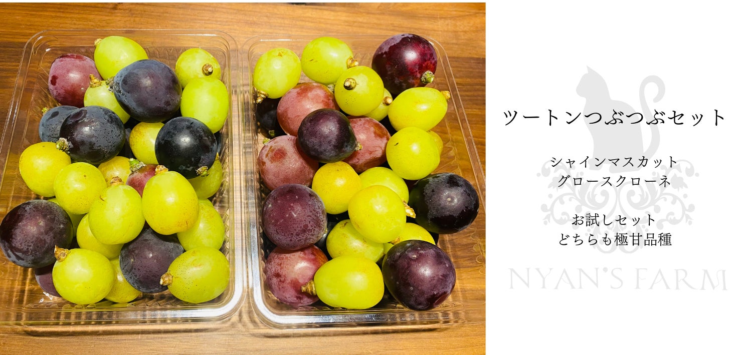 マイハートのかわいさ。バイオレットキングの気高さ。雄宝の上品さ。そして、シャインマスカットの王道感。にゃんずファーム自慢の4種の個性派ぶどうの中から、お好きな2房をお選びいただける特別なセットです。