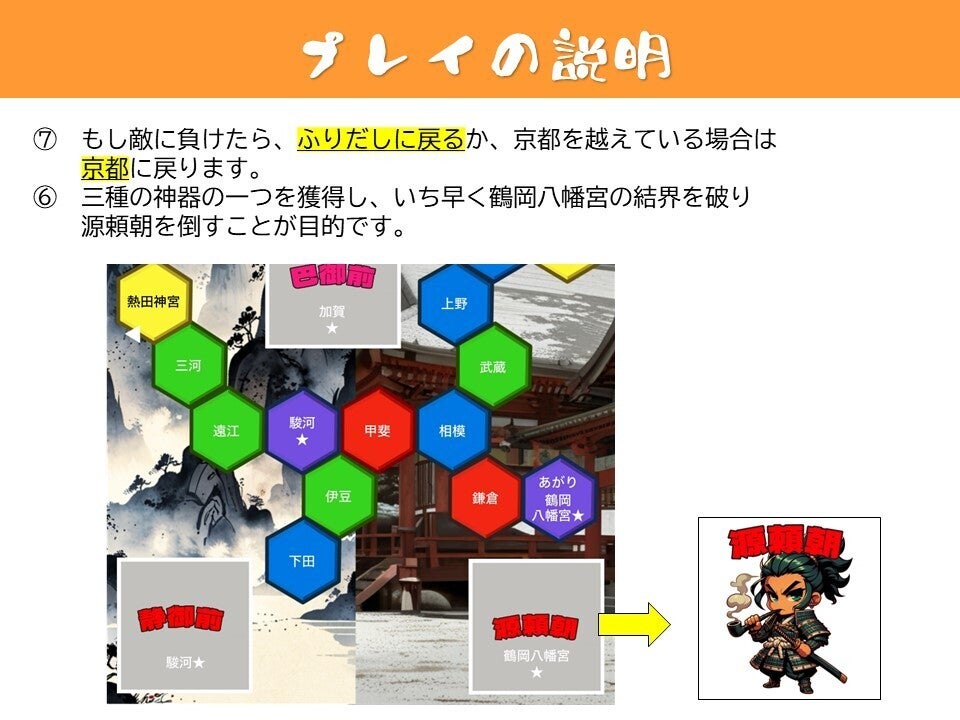 壇ノ浦で滅んだ平家が黄泉の世界から蘇り、源頼朝を倒すため、西日本から鎌倉、鶴岡八幡宮を目指す旅に出るすごろくゲームを作りたい。