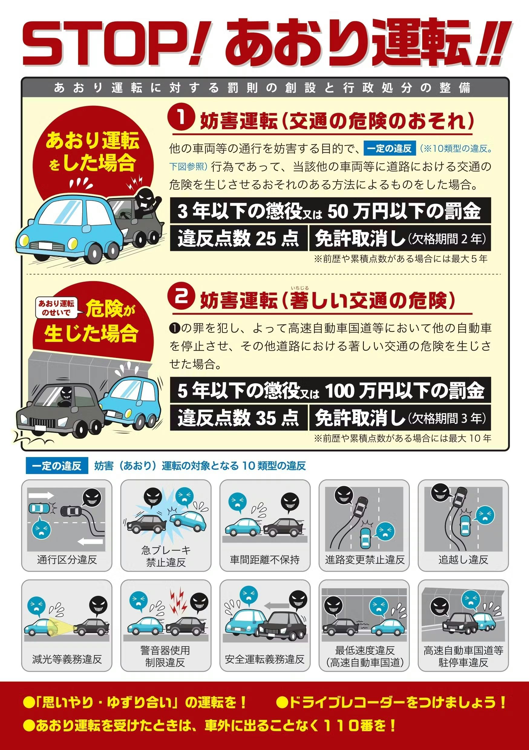 その一例として、国が定める10種類の「妨害運転(いわゆる煽り運転)」が挙げられます。これには、車間距離を詰めすぎる行為や無理な割り込み、急ブレーキの乱用など、重大な事故につながる危険な運転行為が含まれます。