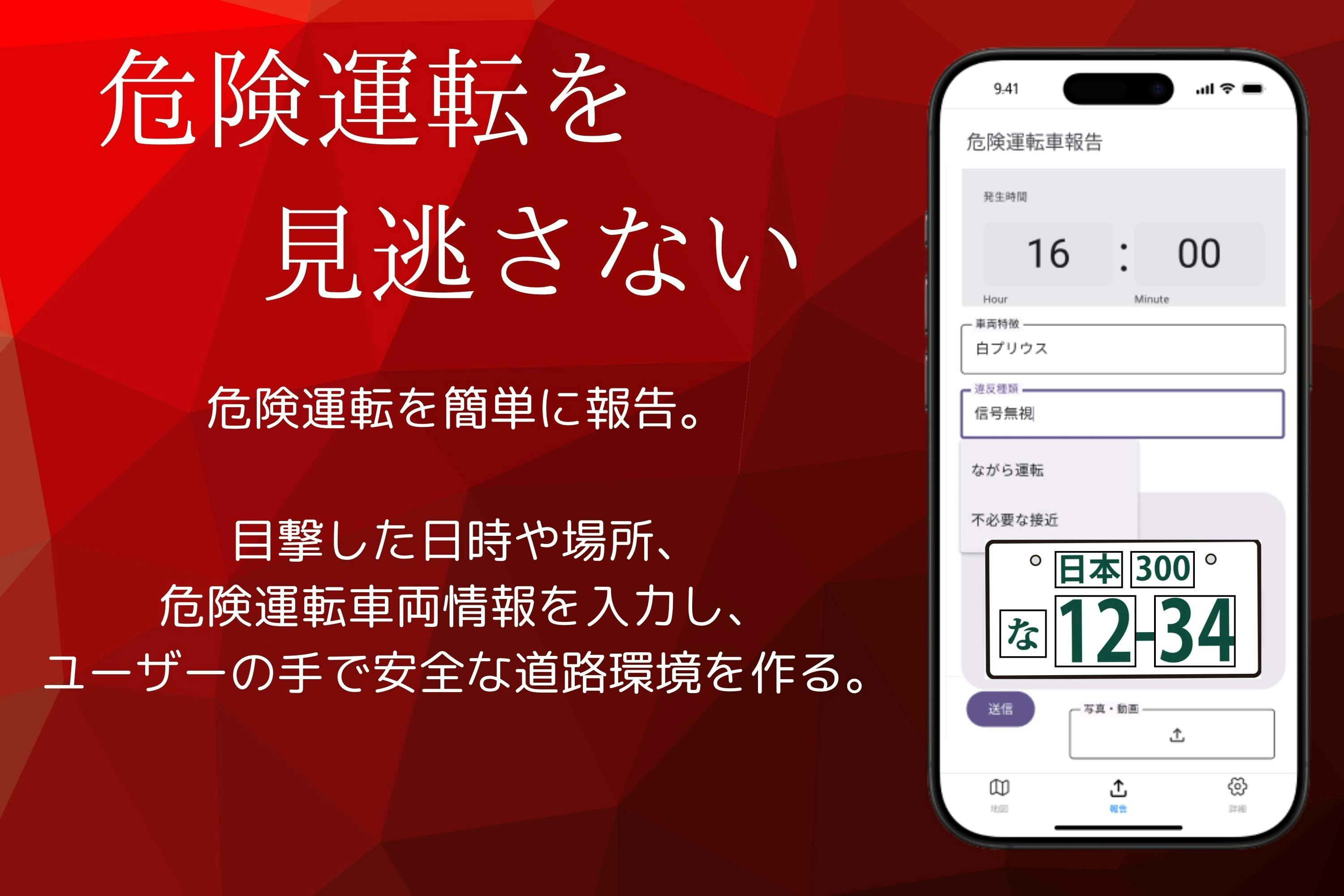 ユーザーが投稿したドライブレコーダーの映像やスマートフォンで撮影した動画・写真、目撃情報などをもとに、危険運転が発生した場所をアプリ内の地図に表示し、共有することで、事故の抑止や安全運転意識の向上を目指します。