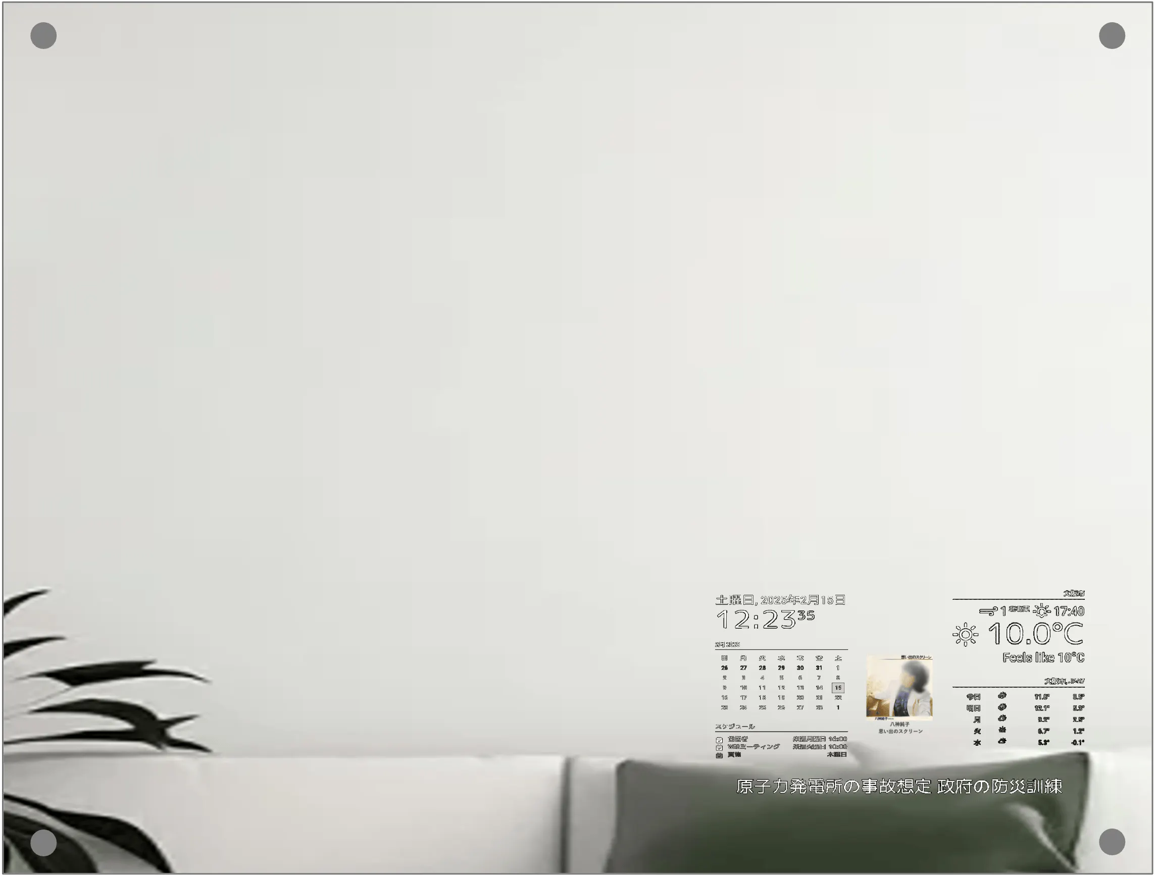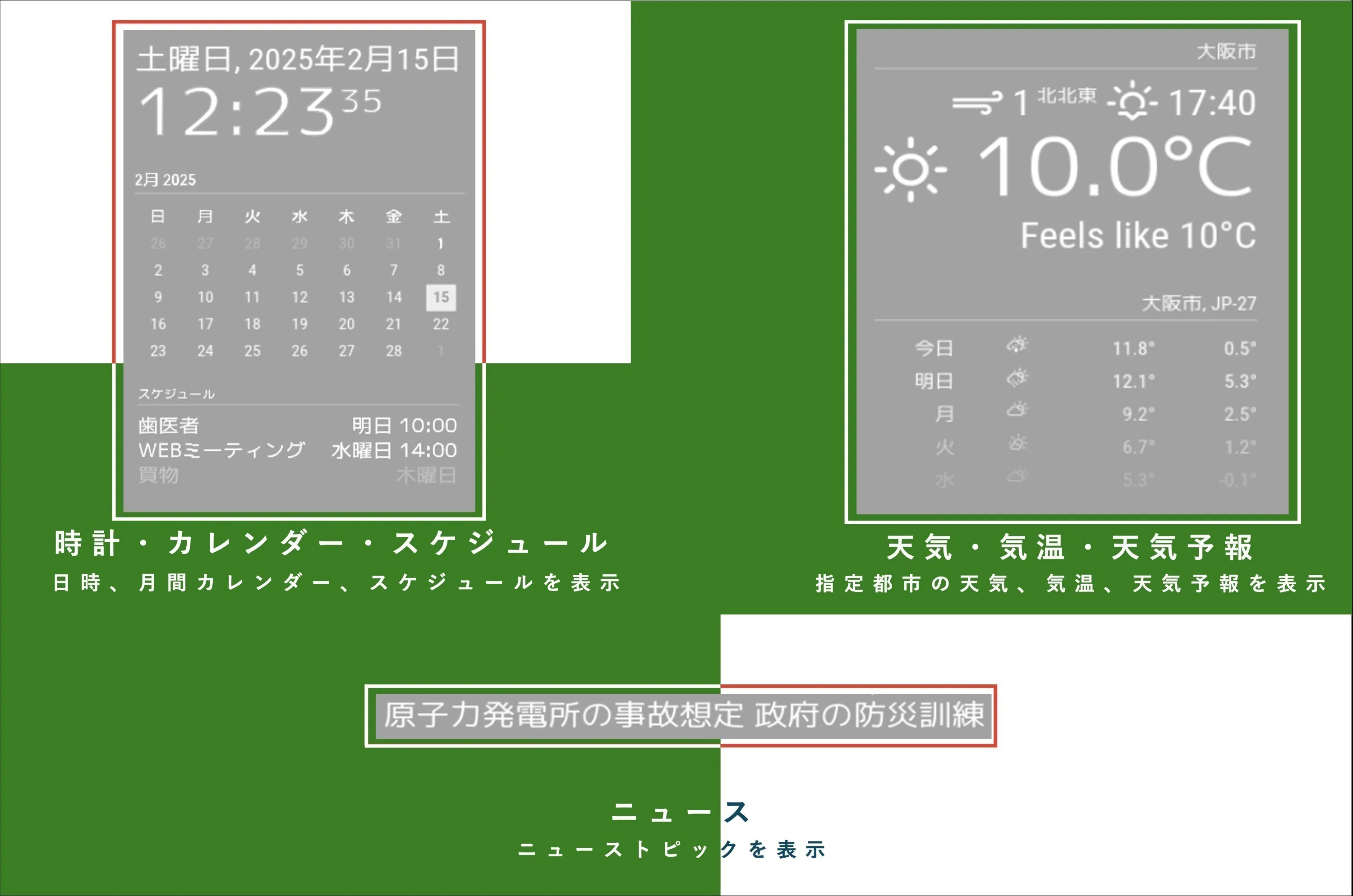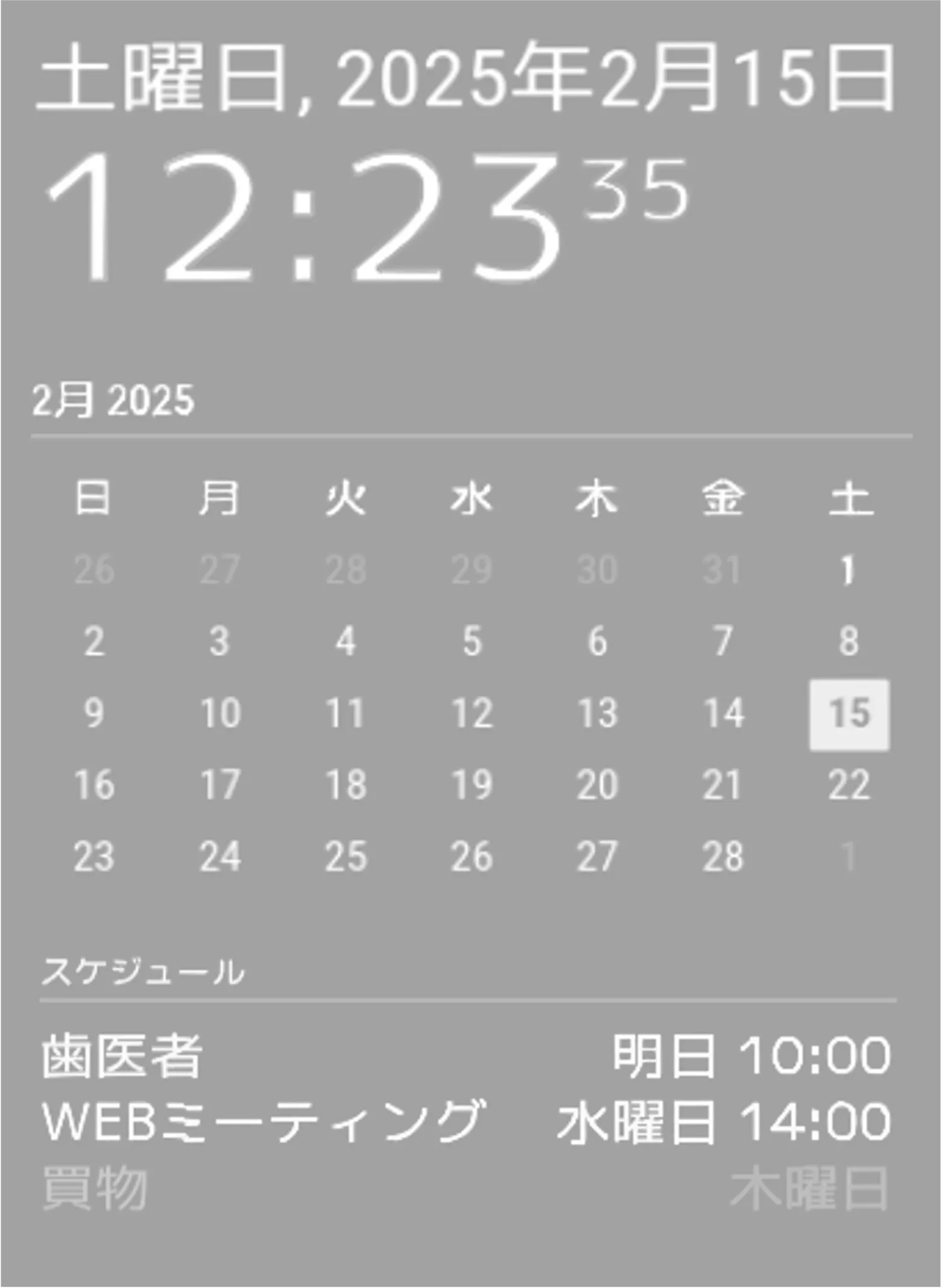 現在時刻、1ヶ月カレンダー、スケジュールを表示します。