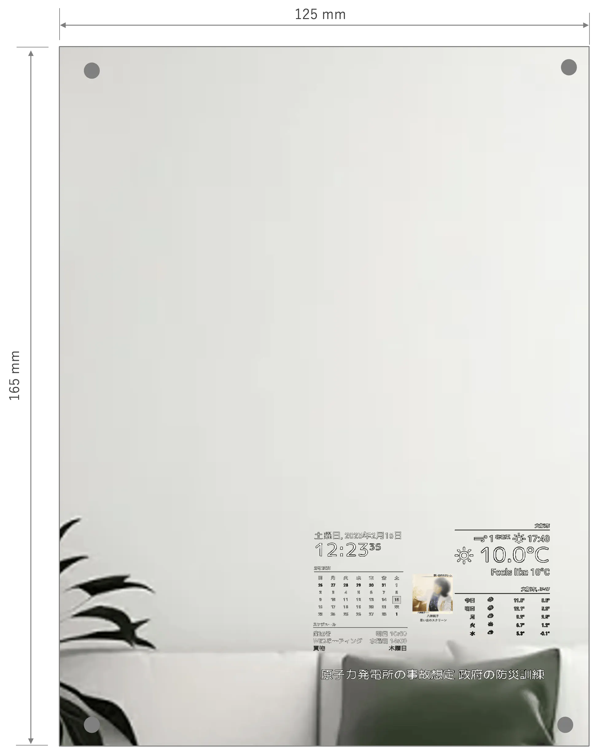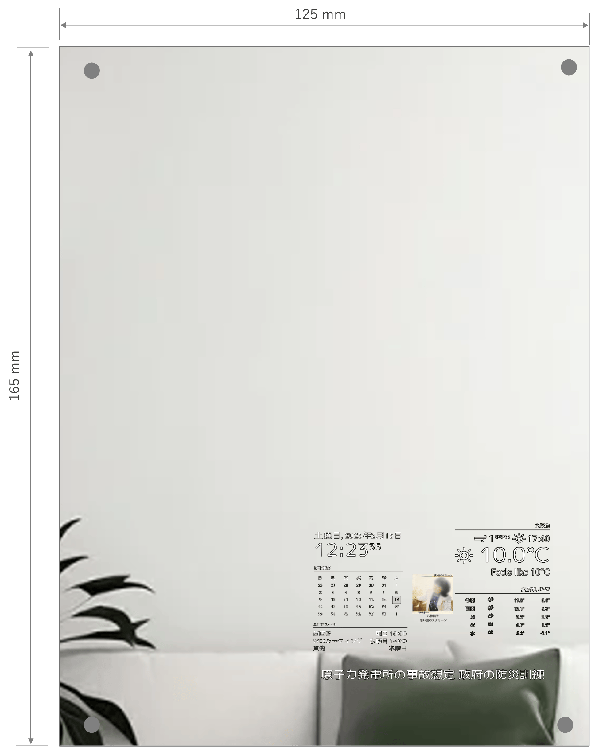 普段の生活の中で身近に置けるIoTデバイスです。縦165mm、横125mmの大きさの鏡の中に小型のディスプレイを内蔵し、時刻、天気予報、ニュースを観たり、楽曲の再生、視聴ができます。ミラーを制御するコンピューターには、省電力小型SBC¹(Raspberry Pi²)を使っています。電源はモバイルバッテリーでも動作を確認しています。