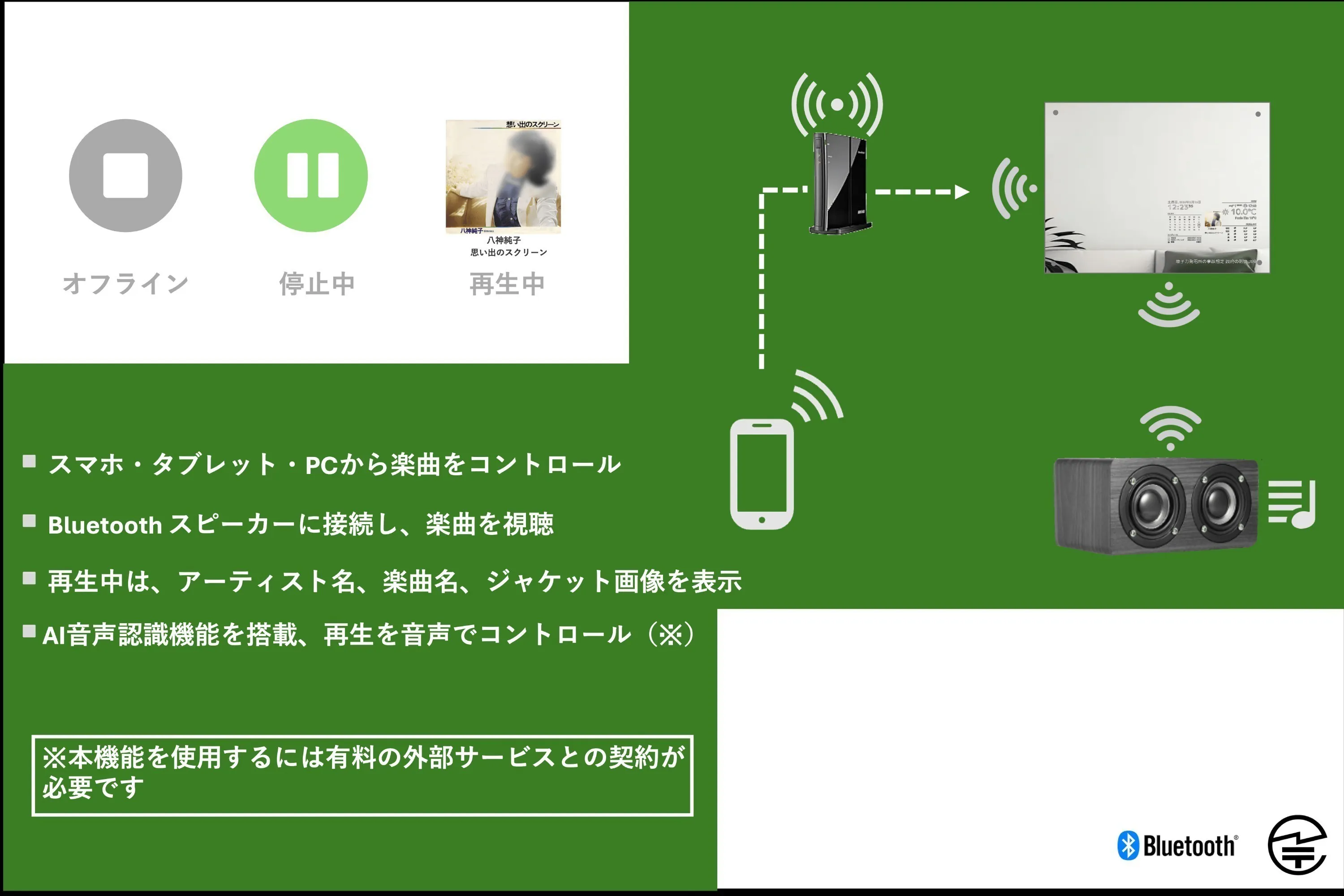 AI音声認識による楽曲の再生操作をサポートしていますので、音声によるコントロールが可能です。「再生・再開」「一時停止」「次の曲を再生」「前の曲を再生」の操作をサポートしています。本機能を利用するには、外部サービスの有料アカウントが必要です。詳細は、サポートWEBで説明いたします。