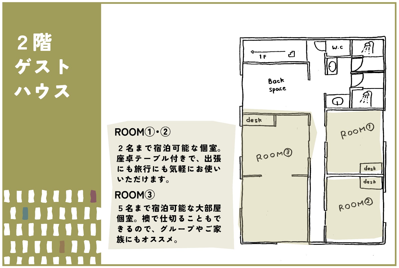 2階の住居空間は、旅・遊び・仕事の拠点として活用できる個室にリノベーション予定