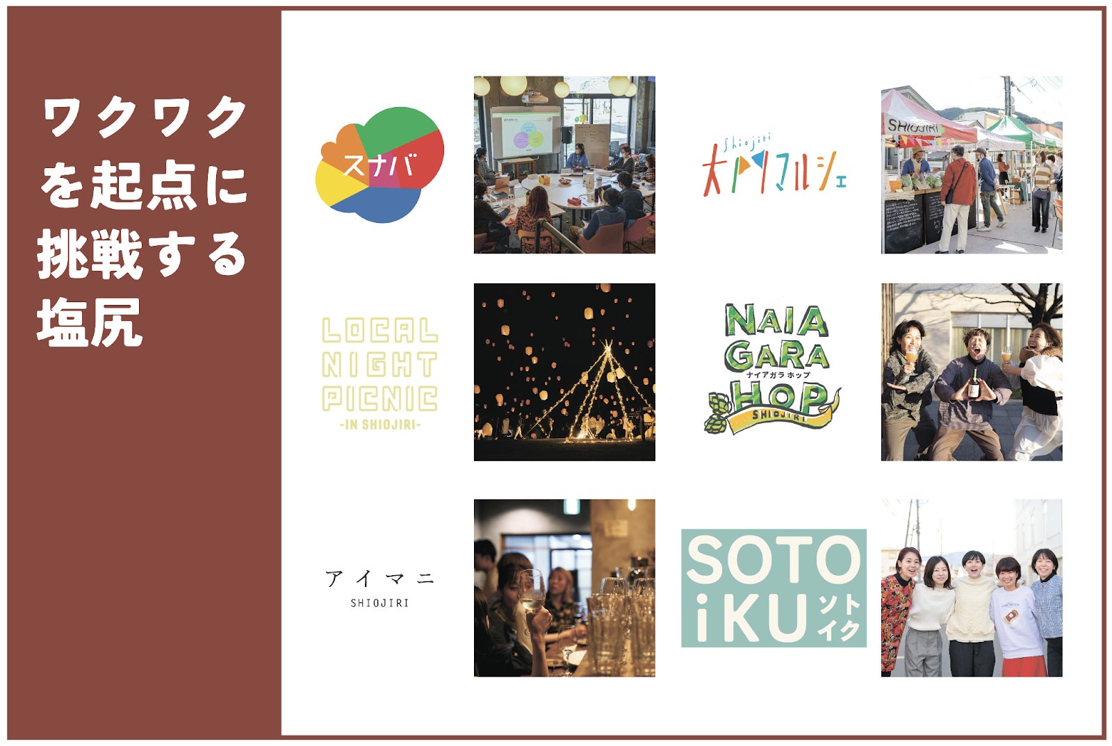 しかし、近年塩尻では移住者も増えており、さまざまな活動や事業が起こっています。何かを起こしたい人が集まり形にしていく拠点「シビック・イノベーション拠点スナバ」や、ワイン・カフェバー「アイマニシオジリ」、非日常なランタンイベント「LOCAL NIGHT PICNIC」、“どローカル”なクラフトビール「ナイアガラホップ」、大門地区の「大門マルシェ」、自分らしく子育てしやすいまちづくりを目指す「ソトイク・プロジェクト」などなど…