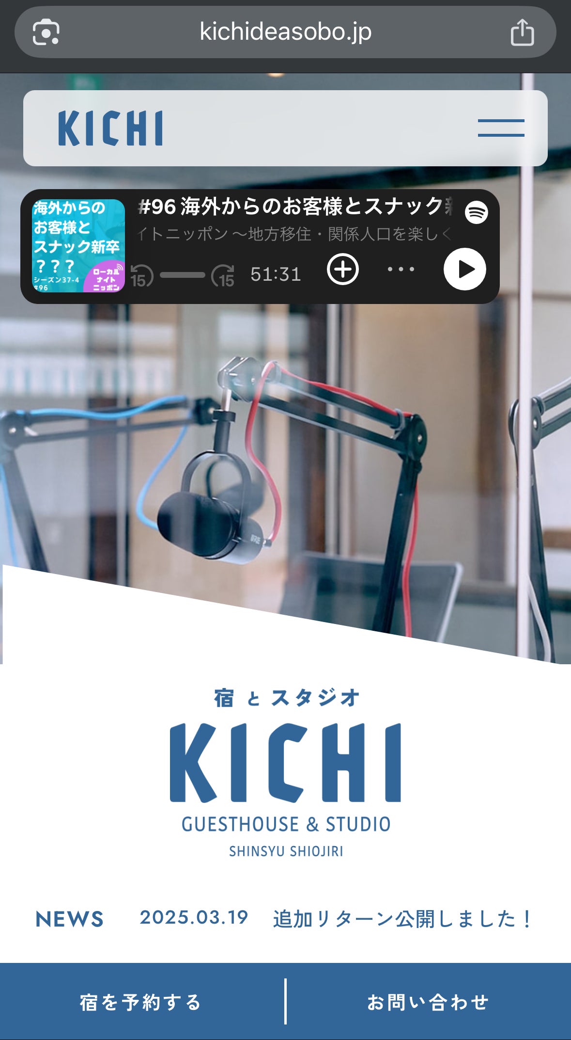 2025/09/10 19:00宿とスタジオKICHIの公式サイトが公開されました。▼公式サイトと宿泊予約https://kichideasobo.jp/宿がオープンして1ヶ月。ようやく公式サイトを公開することができました!ありがとうございます!同時に、直接予約も開始になっており、公式サイトからの予約が一番お得になっております!ぜひご利用ください。▼お得な連泊割(公式サイト)・3泊以上:5%OFF・7泊以上:15%OFF・28泊以上:25%OFFまた、kICHIで利用できるクーポンのリターンも、支援者の皆さんに順次お知らせしていきます。もうしばらくお待ちください。引き続き宿とスタジオKICHIをよろしくお願いします! もっと見る