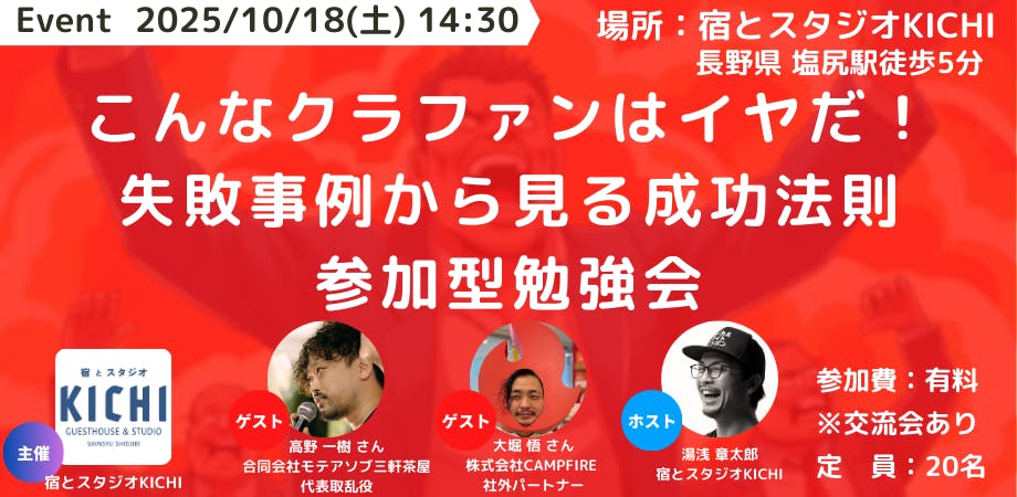 2025/10/10 19:00こんにちは。プロジェクトオーナーの湯浅です。宿とスタジオKICHIの運営が始まって早2ヶ月。8月末からはWeb予約も開始され、週末を中心にお客様にご利用いただけるようになってきました。今の個人的なミッションは「毎週イベントを開催する!」です。秋は季節もよく、ターミナル駅の塩尻駅近くということでお客様にご利用いただいていますが、12月以降は観光客も減ってきます。KICHIのキーワードである「目的地になる」という部分をもっと体現していかないと利用していただけない時期だと思います。そこで、毎週何らかイベントを開催し、「それなら行ってみようかな。」「あそこ、いつも面白いことしてるな。」と思っていただけるようにしていこうと思います。10月の目玉イベントの一つがこちら。こんなクラファンはいやだ!失敗事例から見る成功法則|参加型勉強会イベント詳細&申し込み:https://peatix.com/event/4591139KICHIのクラウドファンディングをサポートしてくれた株式会社CAMPFIRE 社外パートナーの ぼりさんと、クラウドファンディングを立ち上げまくる合同会社モテアソブ三軒茶屋 代表取乱役 カズキタさんをゲストに、失敗事例やKICHIの裏話を元にクラウドファンディングの勉強をしちゃおうというイベントです。イベント後は参加者とゲストの交流会もありますので、これを機会に面白い参加者の皆さんと繋がっちゃいましょう!ご参加お待ちしています^^ もっと見る