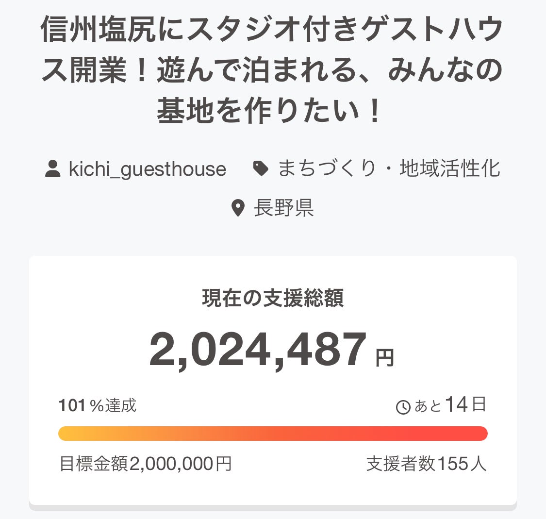 いつもKICHIのクラウドファンディングを応援いただき、ありがとうございます!皆様の温かい応援のおかげで、「宿とスタジオ KICHI」は少しずつ形になり始めています。今回はKICHIを一緒に創り上げ、育てていく"初期メンバー"になれる『塩尻lab』の紹介です!▼ 塩尻lab第6期とは?塩尻labは、地域のリアルな課題に向き合い、その解決策を「仕様書(プロジェクト企画書)」として形にし、実践していくプログラムです。KICHIのプロジェクトで何をするか、まだ何も決まっていません!(笑)が、塩尻lab期間中にKICHIがオープンすることもあり、オープンするために必要なこと、やりたいこと、なんでもできる可能性があります。「面白そう!」と思ったら、ぜひ参加してください。ちなみに下記のポッドキャストで塩尻LabやKICHIのプロジェクトについて語っておりますので、ぜひチェックしてみてください^^▼#78 KICHIのオープニングに関わる!塩尻labって?(ローカルナイトニッポン)https://open.spotify.com/episode/05vtjCGv9mUUzQykHLwg4o?si=0a50237694da4752▼ 塩尻lab第6期申し込みフォームhttps://docs.google.com/forms/d/e/1FAIpQLSdyQrm2JREJEBk_2awdYQcCxLeW03vGmXbtEUssAmM2zkoKlA/viewform▼ KICHIプロジェクトはこんな方におすすめ! KICHIの立ち上げに"初期メンバー"としてゼロから関わりたい方! イベント企画、スペース運営、コミュニティづくり、情報発信などに興味がある方 自分のアイデアを実験・実践する場が欲しい方 塩尻という地域で、新しい人の流れや文化を創りたい方 「面白そう!」という気持ちを原動力に、主体的に動ける方 ▼ 塩尻lab第6期 募集概要 実施期間: 2025年7月5日(土)〜8月29日(金) カリキュラム概要: オンラインでのキックオフ・中間報告、塩尻でのフィールドワーク(2回)、仕様書作成・報告会など 参加費: 22,000円(税込) 定員: 20名程度 応募締切: 2025年6月8日(日)23:59 詳細・応募方法: 以下のリンクよりご確認ください! KICHIプロジェクトの詳細(note): https://shiojiri-city.note.jp/n/n718bfbe57d4f 塩尻lab:https://www.meguru-jinji.com/ekkyo/shiojirilab/ 応募締切は【6月8日(日)】と迫っています!この特別な機会に、私たちと一緒にKICHIを、そして塩尻の未来を創る挑戦をしませんか?皆さんのご参加を、心よりお待ちしております!(KICHIプロジェクト以外のテーマを選択することも可能です)