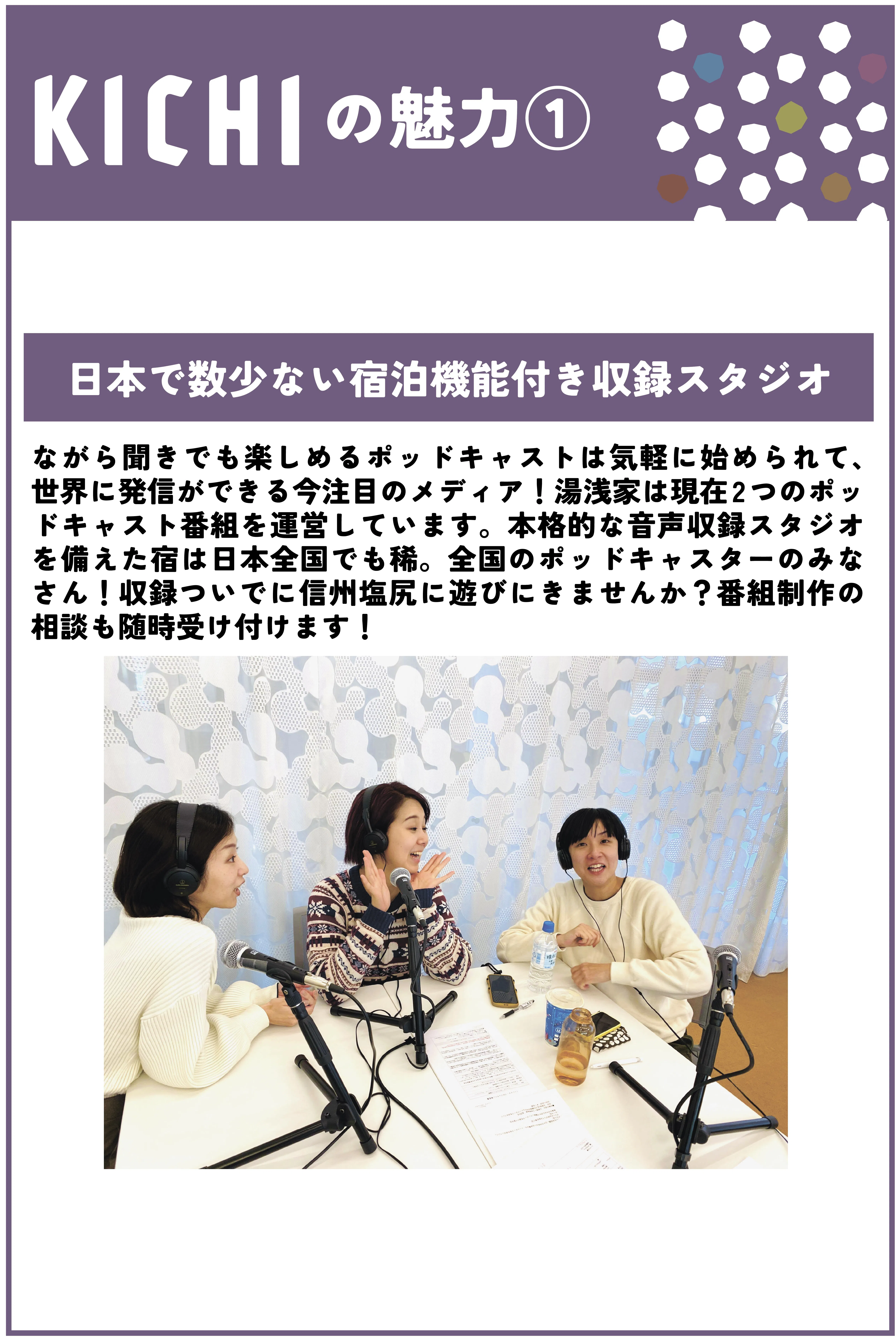 年齢も性別も、暮らす街さえも飛び越えて人々が声で繋がるポッドキャスト。そんなポッドキャストを盛り上げる新たなスポットが塩尻に!宿とスタジオKICHI はエネルギッシュな湯浅家だからこそ実現し得た「つながり空間」ですね。
