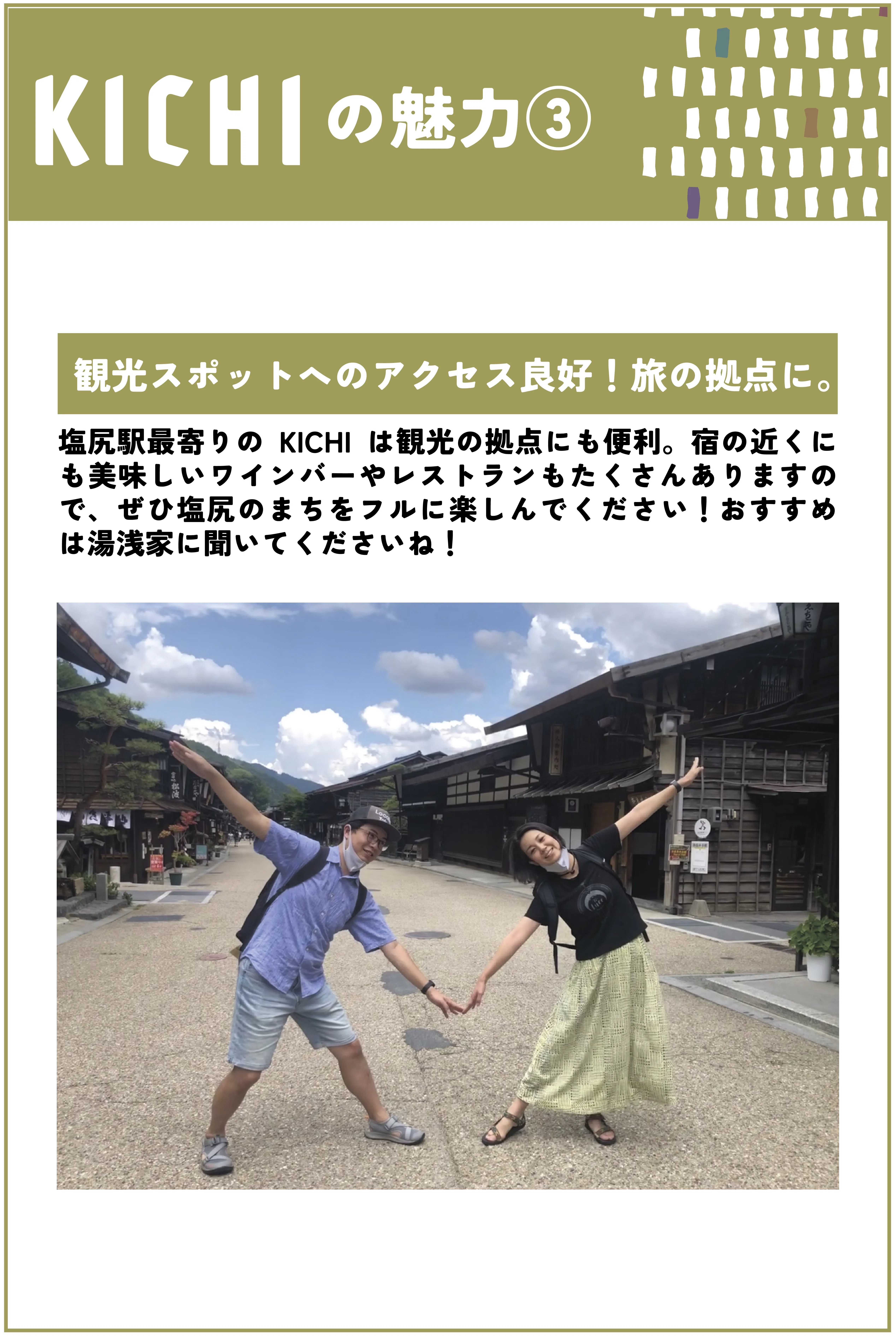 「塩尻に遊びにおいでよ!」と誘える場所をつくりたいな塩尻大門というまちが誰もが自分らしくいられる居場所になったらいいな。そんな想いがKICHIの始まりでした。KICHIは経験も知識もお金もない…私たち夫婦にとって、とても大きな挑戦です。