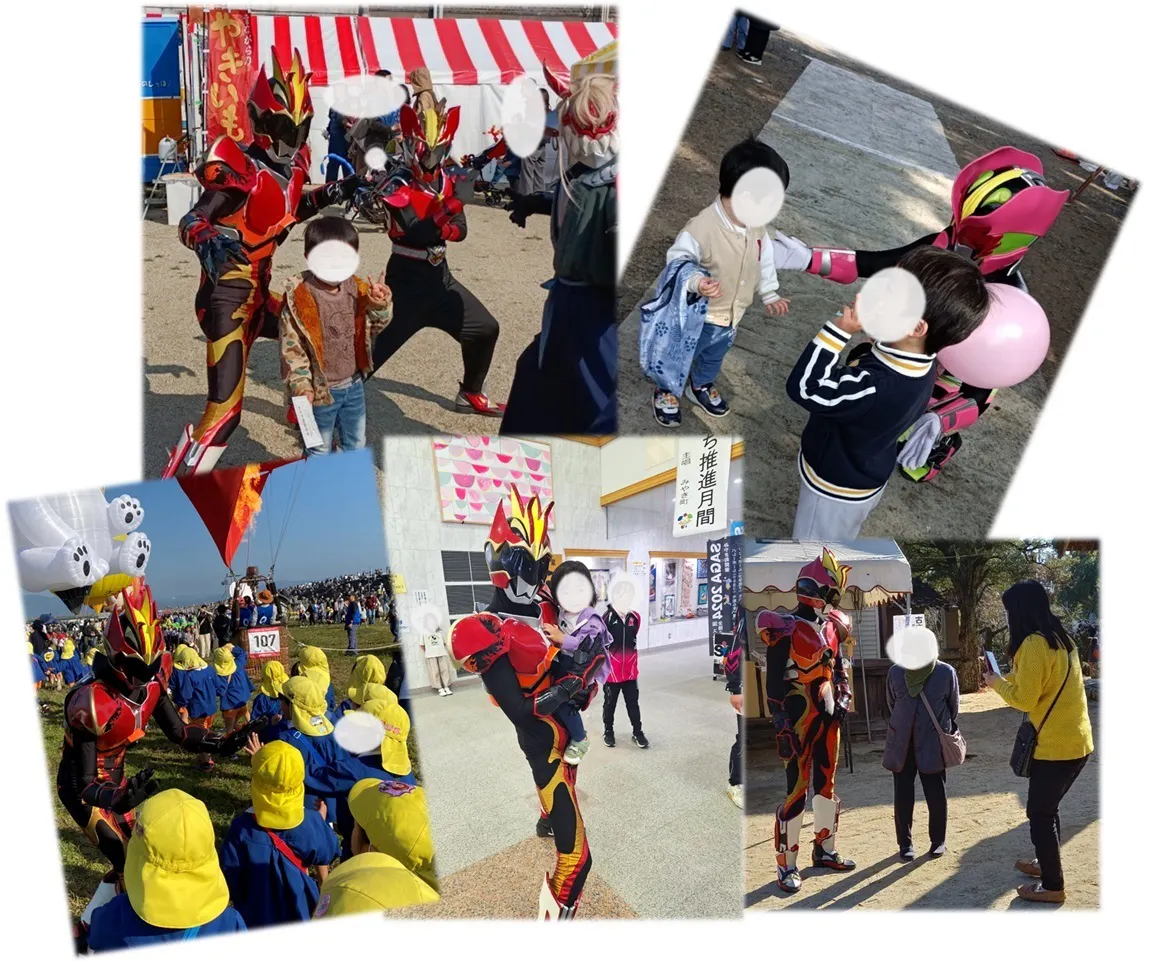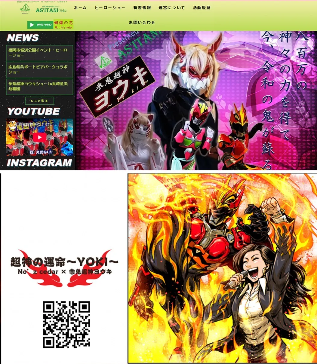 当初は「参鬼超神ヨウキ炎武」1体でのグリーティング(来場者とのふれあい等)のみの活動で様々なローカルヒーローの先輩たちに教えを乞いながらの手探り活動でしたが有難い事に徐々にご依頼いただける様になり2023年12月に個人事業として開業し、名前を「参鬼超神ヨウキ実行委員会」から「As'itani-アシタニ-」と変えました。